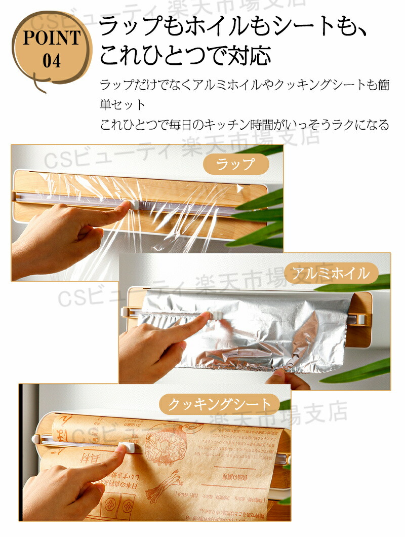 ラップだけでなく、アルミホイルやクッキングシートもセット可能。これひとつで作業効率アップ。