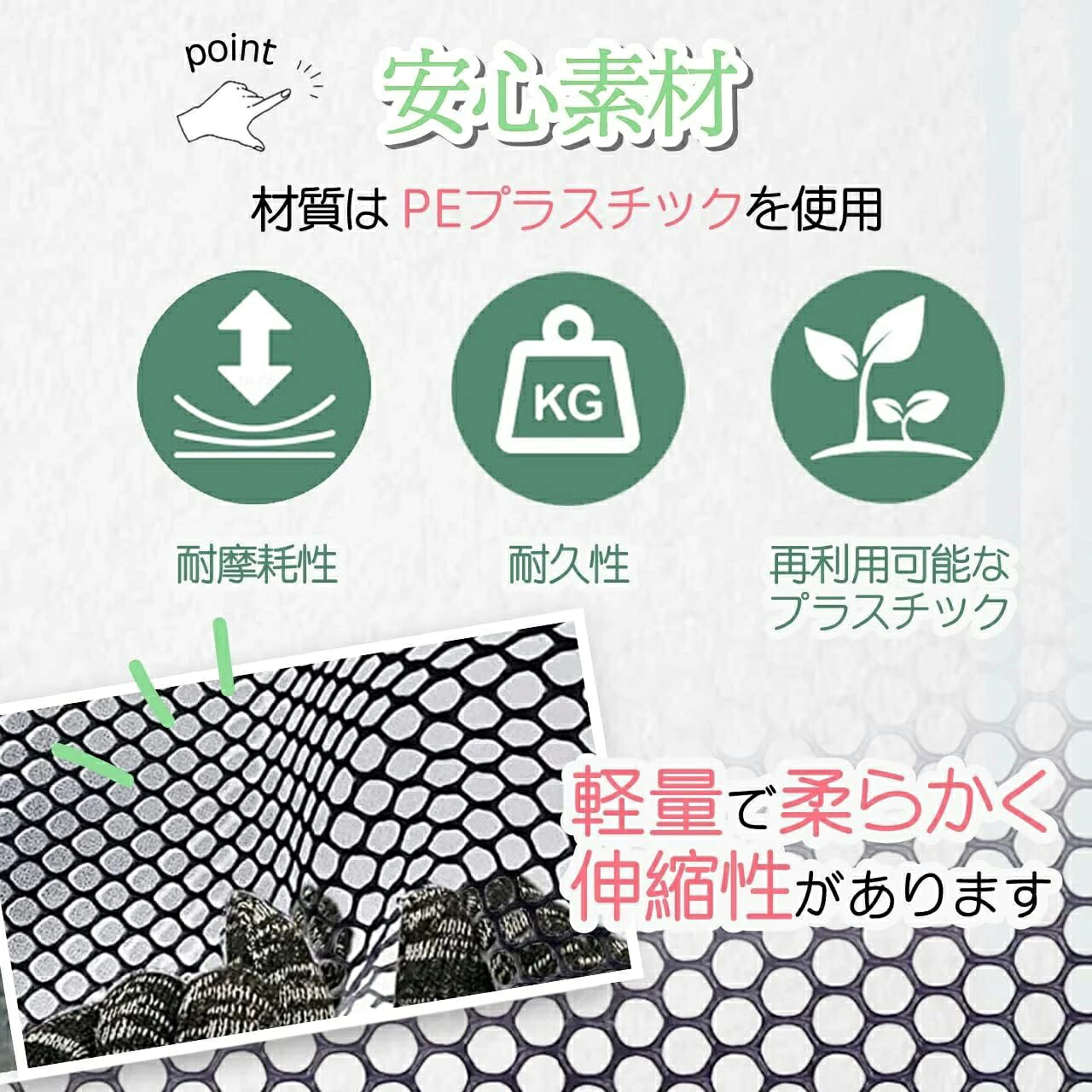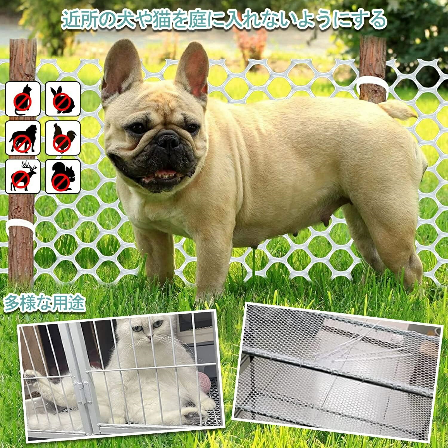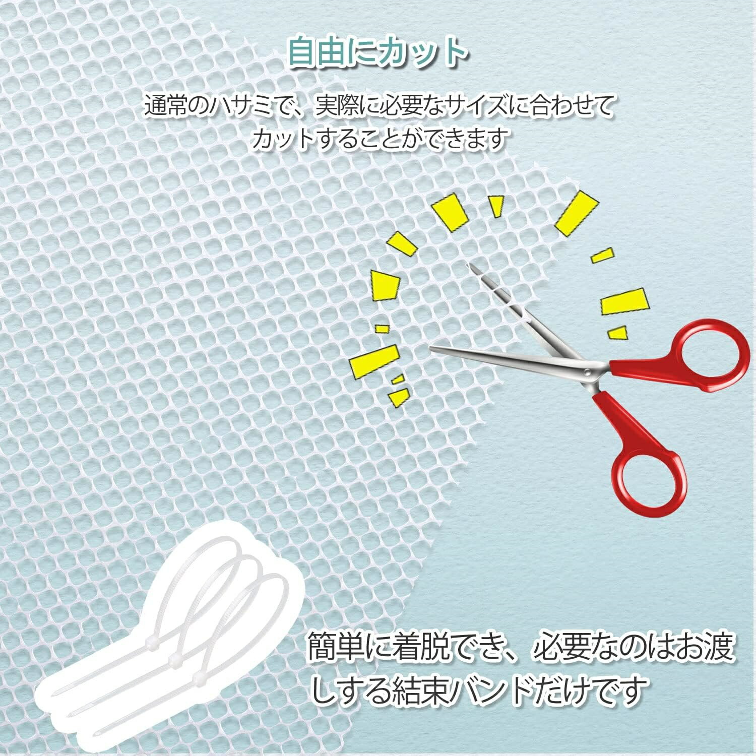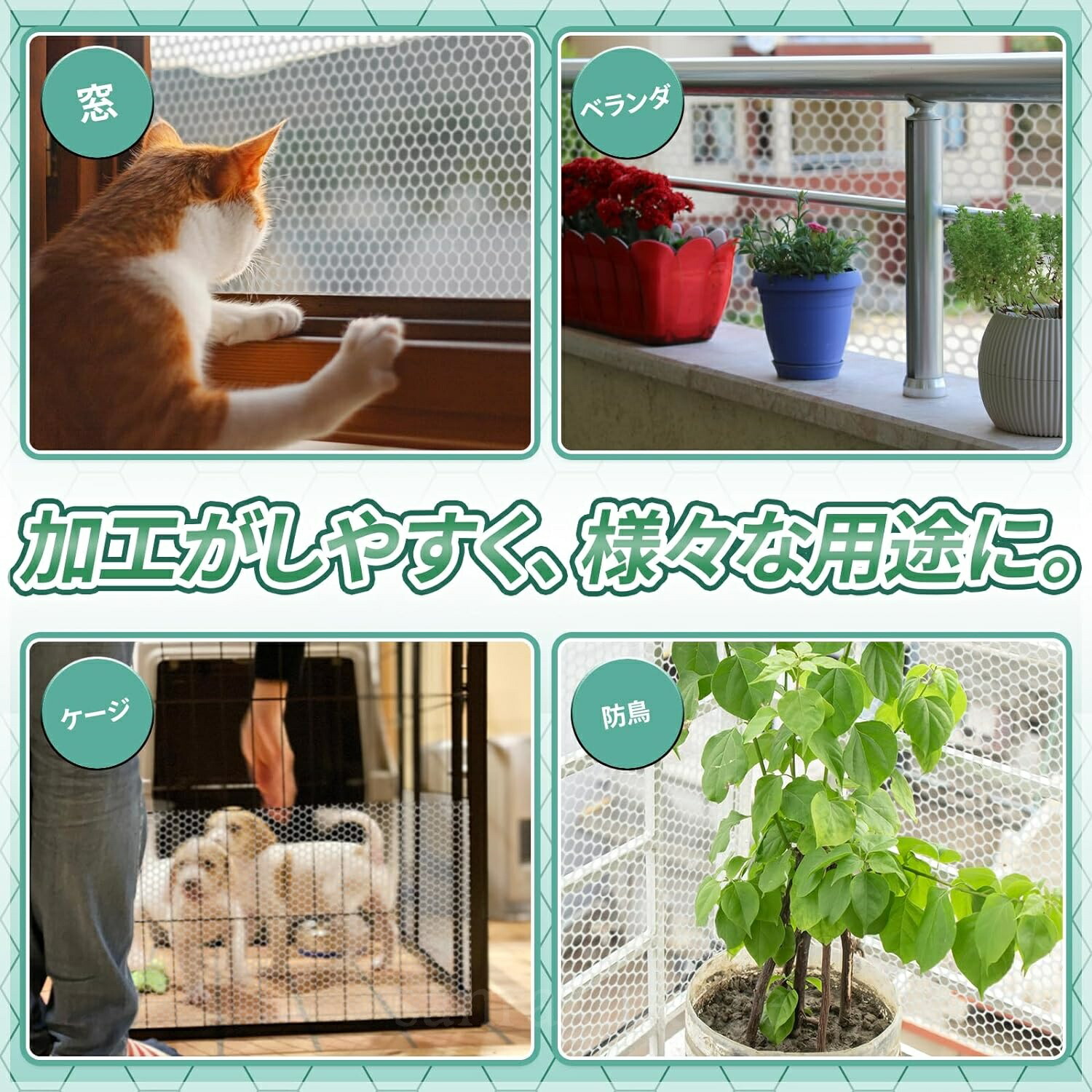 丈夫なプラスチック素材で長期間使用可能。透明感のある目立ちにくいホワイトカラーで、見た目もすっきり。ペットや子供の安全確保に役立つ信頼のフェンスネットです。