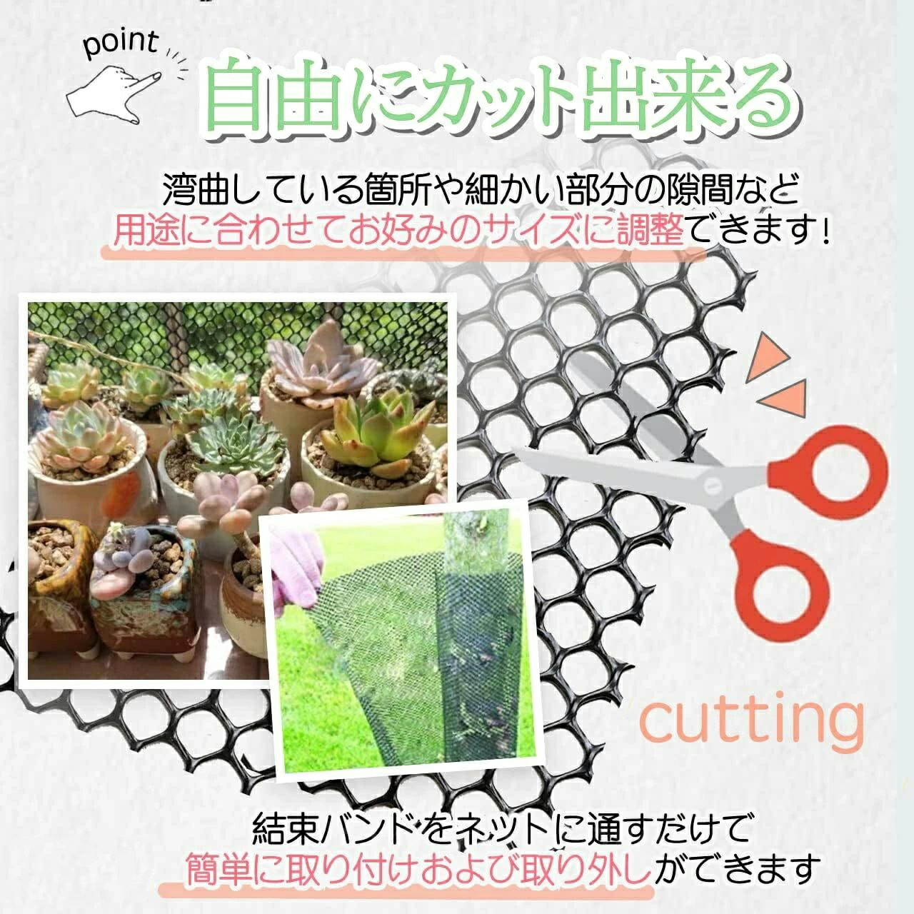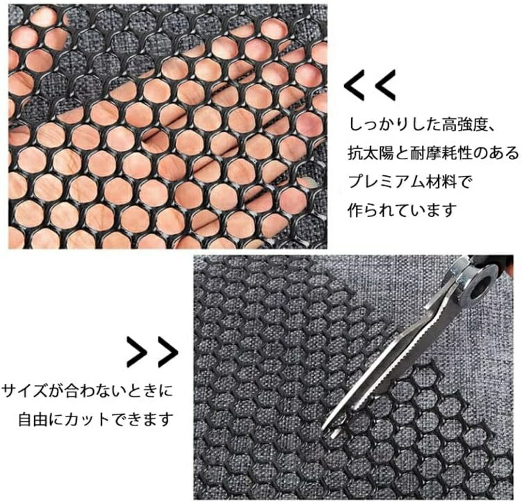 軽量プラスチック製で扱いやすく、ハサミで自由にカットできるため設置も簡単。通気性が良く風通しを妨げず、屋内外問わず多目的に利用できます。