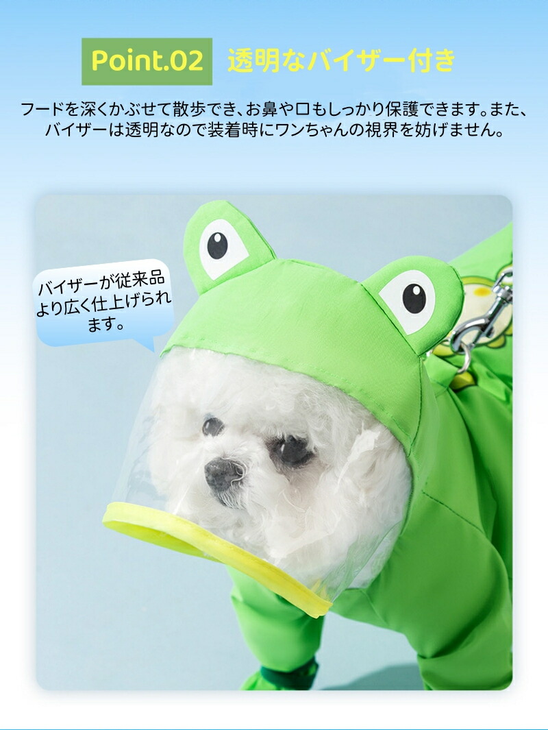 広く仕上げられた透明バイザーはフードを深くかぶせてでき、お鼻と口をしっかり保護する同時に、ワンちゃんの視野に妨げずに自由に雨の中で遊べます。