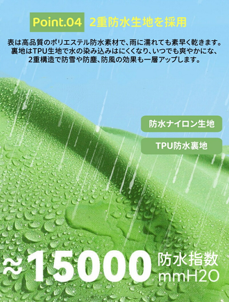 アウトドアジャケットに使われている生地を採用し、撥水性・防風性を兼ね備えた機能レインコートで、汚れたら濡れたタオルで拭き取るだけでキレイになり、お手入れすごく簡単!
