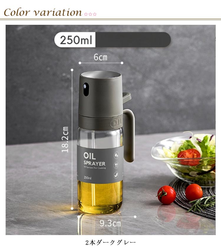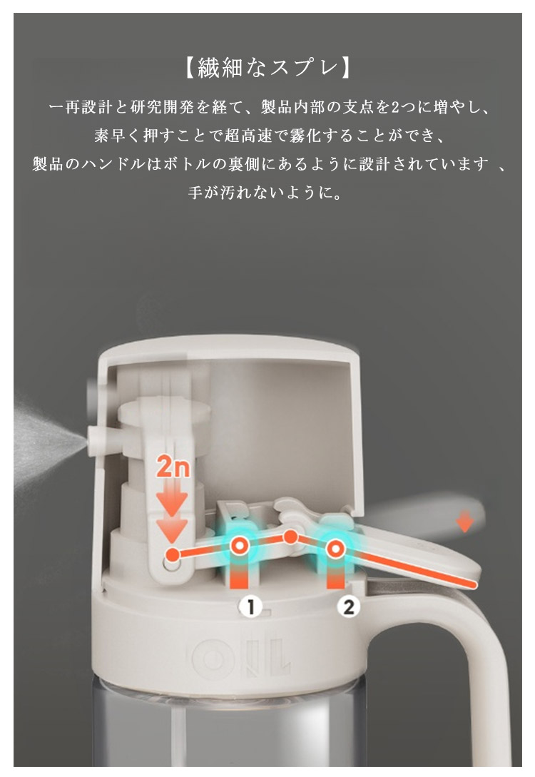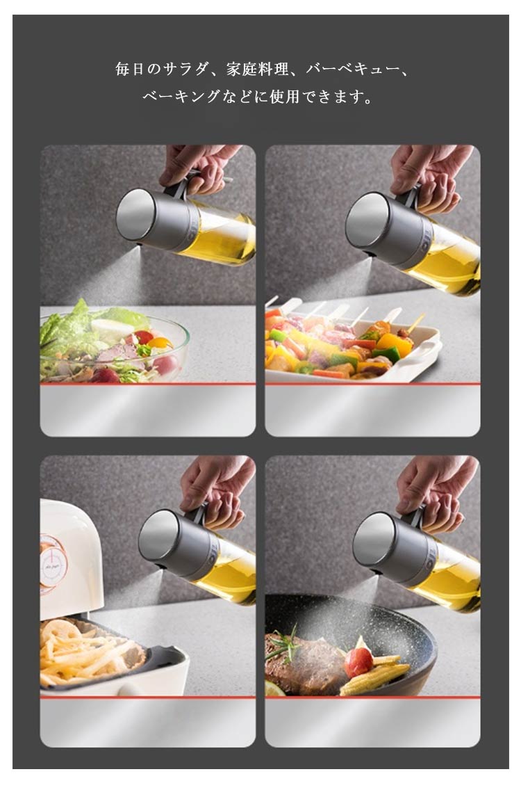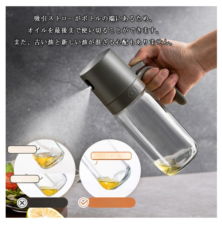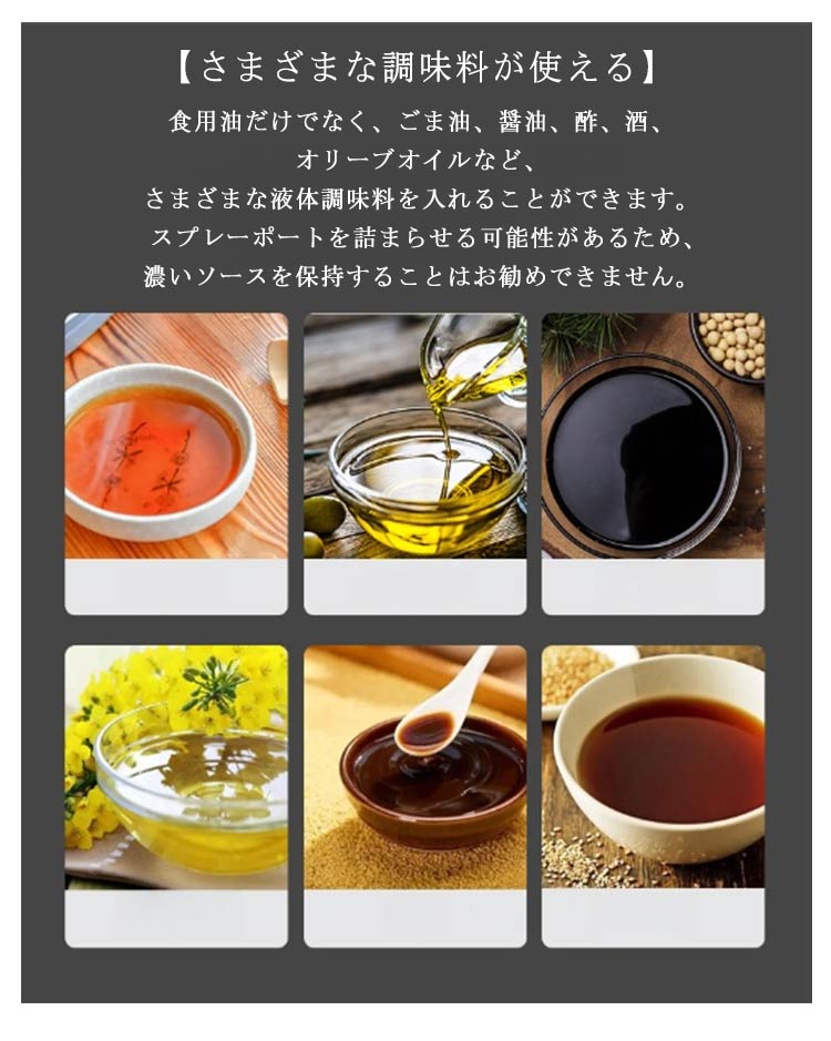 【さまざまな調味料が使える】 食用油だけでなく、ごま油、醤油、酢、酒、オリーブオイルなど、さまざまな液体調味料を入れることができます。 スプレーポートを詰まらせる可能性があるため、濃いソースを保持することはお勧めできません。 毎日のサラダ、家庭料理、バーベキュー、ベーキングなどに使用できます。