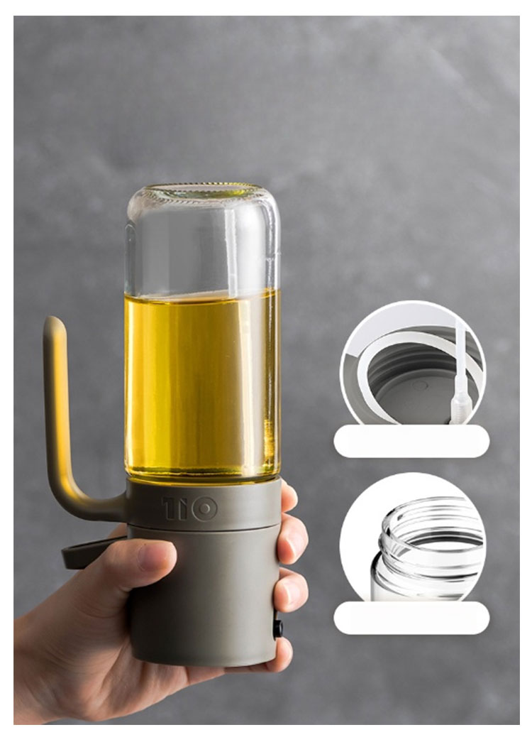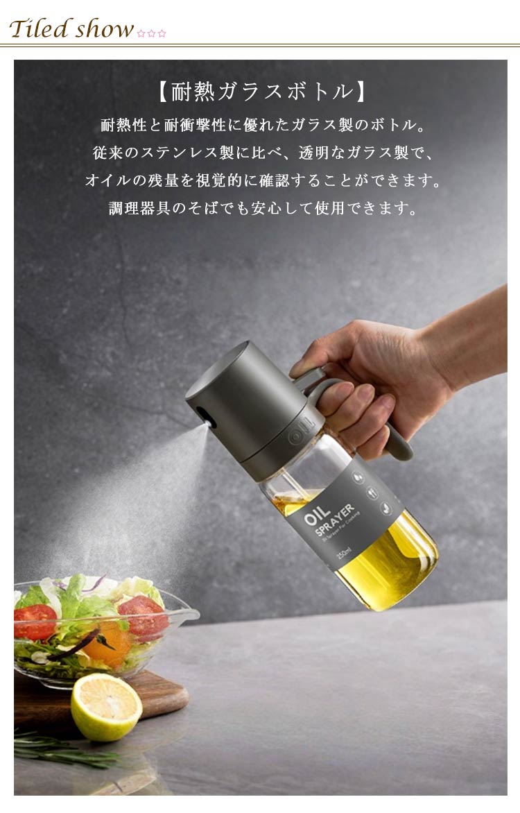 【耐熱ガラスボトル】耐熱性と耐衝撃性に優れたガラス製のボトル。従来のステンレス製に比べ、透明なガラス製で、オイルの残量を視覚的に確認することができます。調理器具のそばでも安心して使用できます。