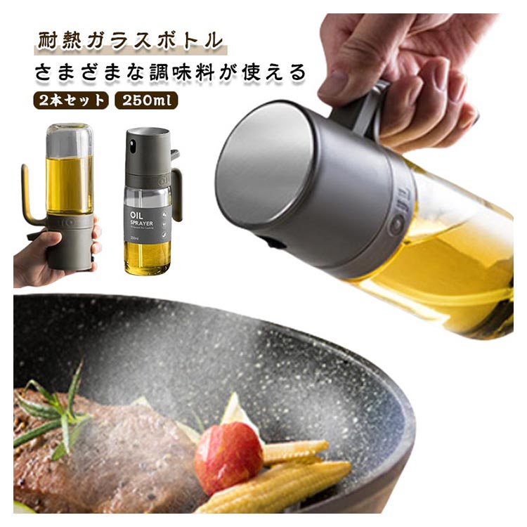 2本セット キッチン ボトル オイルポット ガラスボトル透明 霧吹き 料理用 250ml スプレーボトル ミスト 調味料入れ 油さし醤油スプレー 120°オリーブオイル 耐 漏れ防止噴霧器