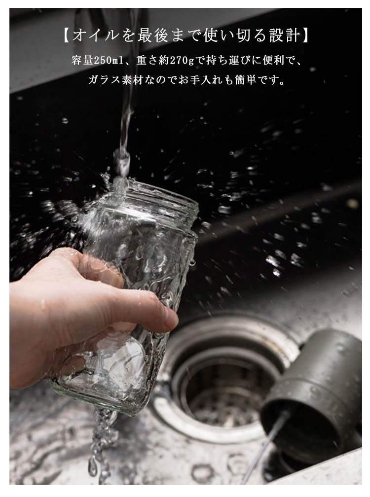 【オイルを最後まで使い切る設計】容量250ml、重さ約270gで持ち運びに便利で、ガラス素材なのでお手入れも簡単です。吸引ストローがボトルの端にあるため、オイルを最後まで使い切ることができます。また、古い油と新しい油が混ざる心配もありません。