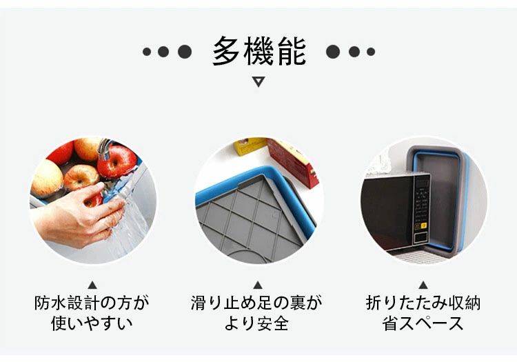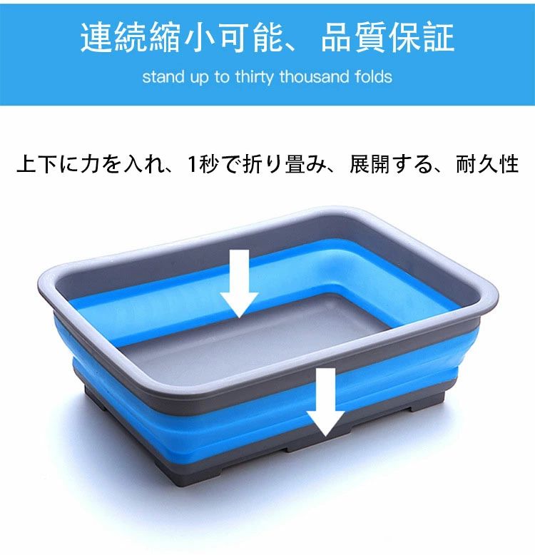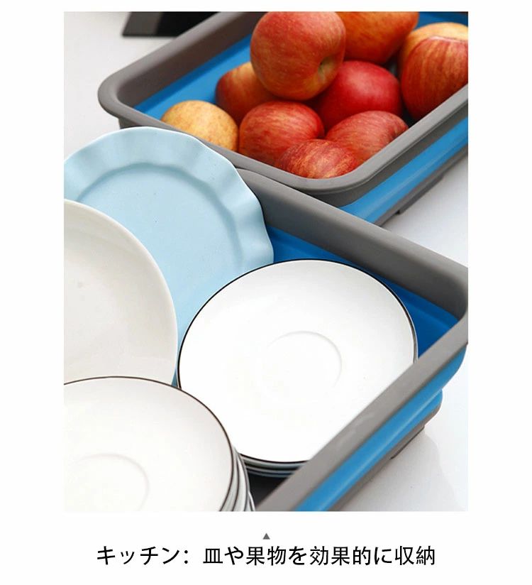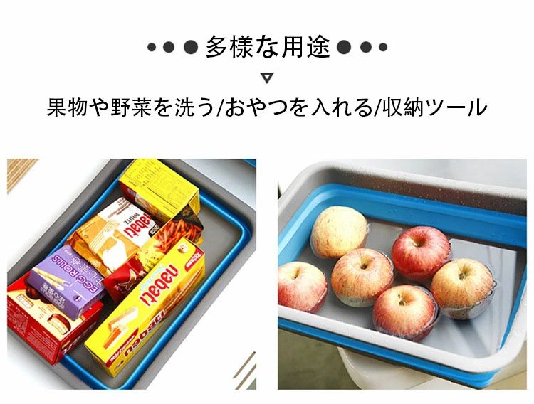用途:折りたたみ収納でスペースを節約し、いろいろなものを置いたり、果物や野菜を洗ったり、持ち運びに便利で、旅行やアウトドアに適しています
