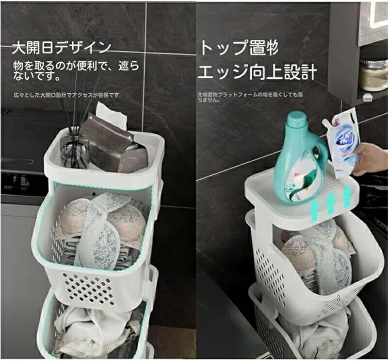 ランドリーバスケット 上下2/3段のバスケットに洗濯物を分類、バスケットには着替えやタオルなどを収納でき、上部トレーにはボディーソープ、洗面料等を収納でき、キッチン、リビングも使え普段でよく使う小物などの収納も大活躍です!