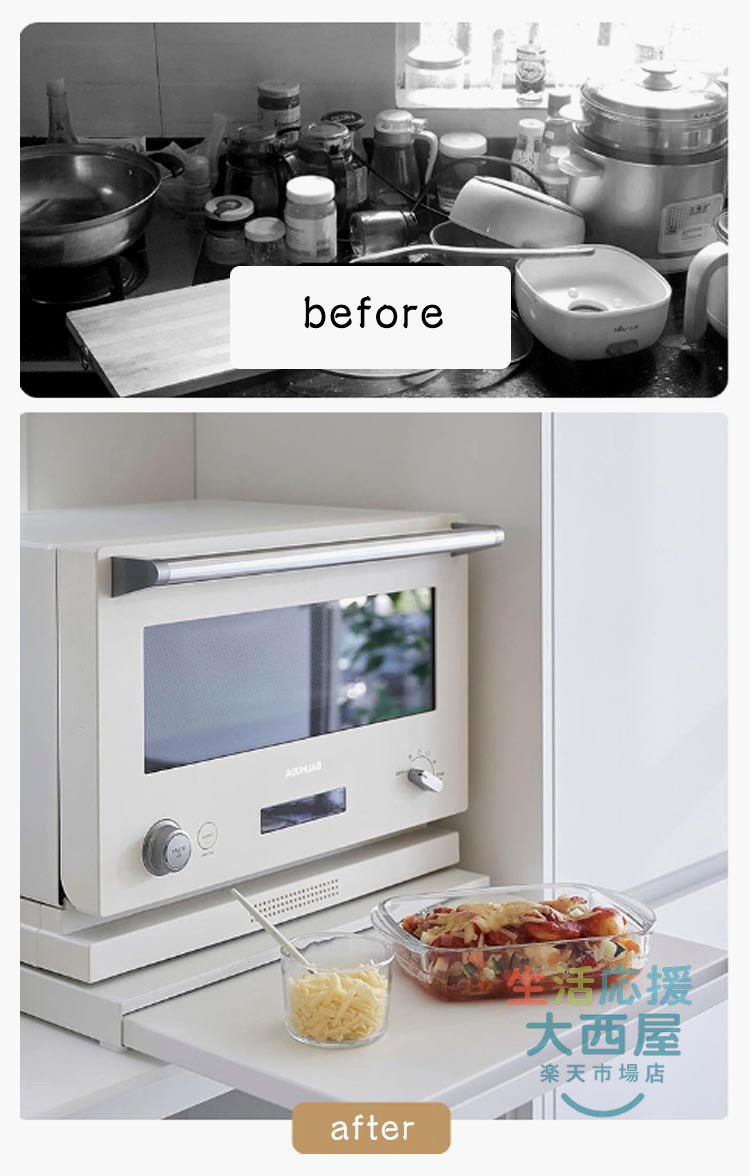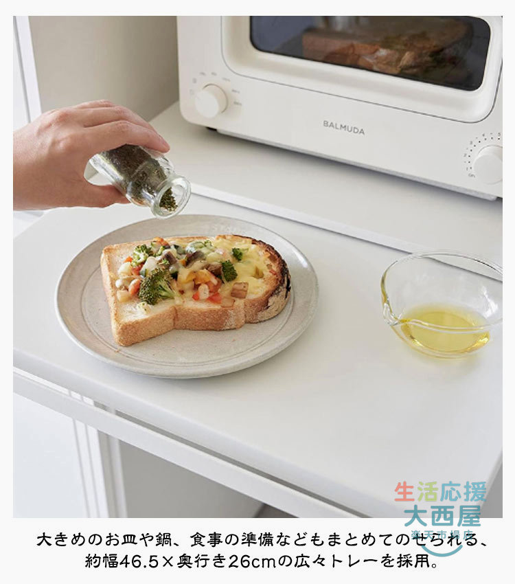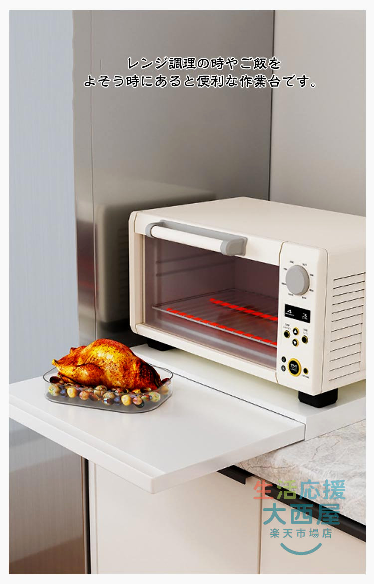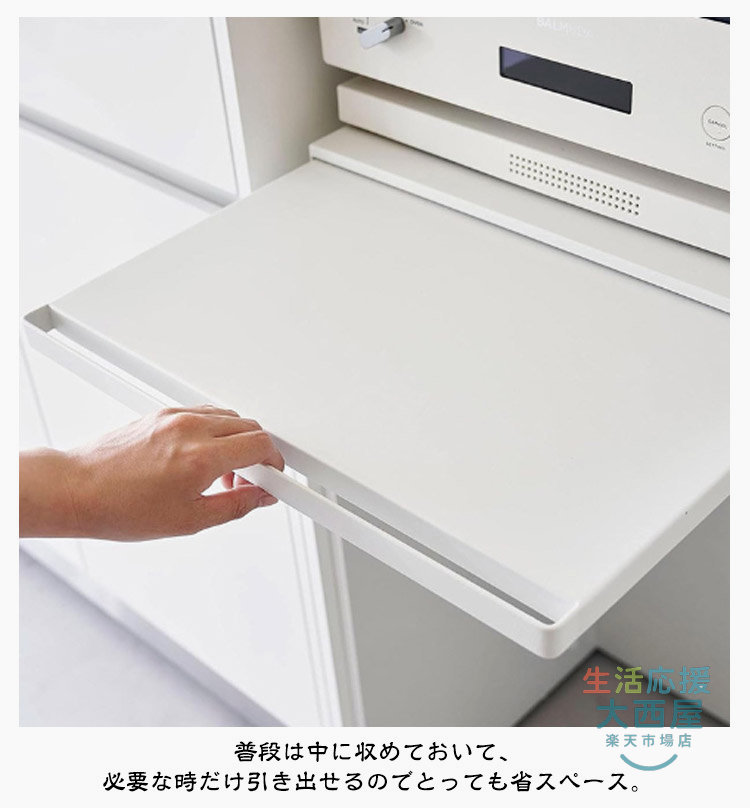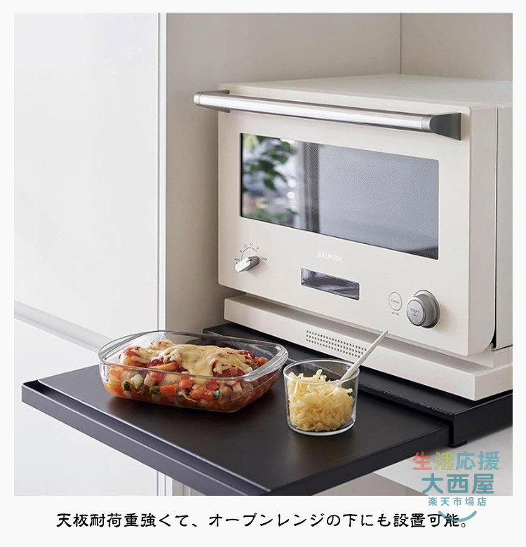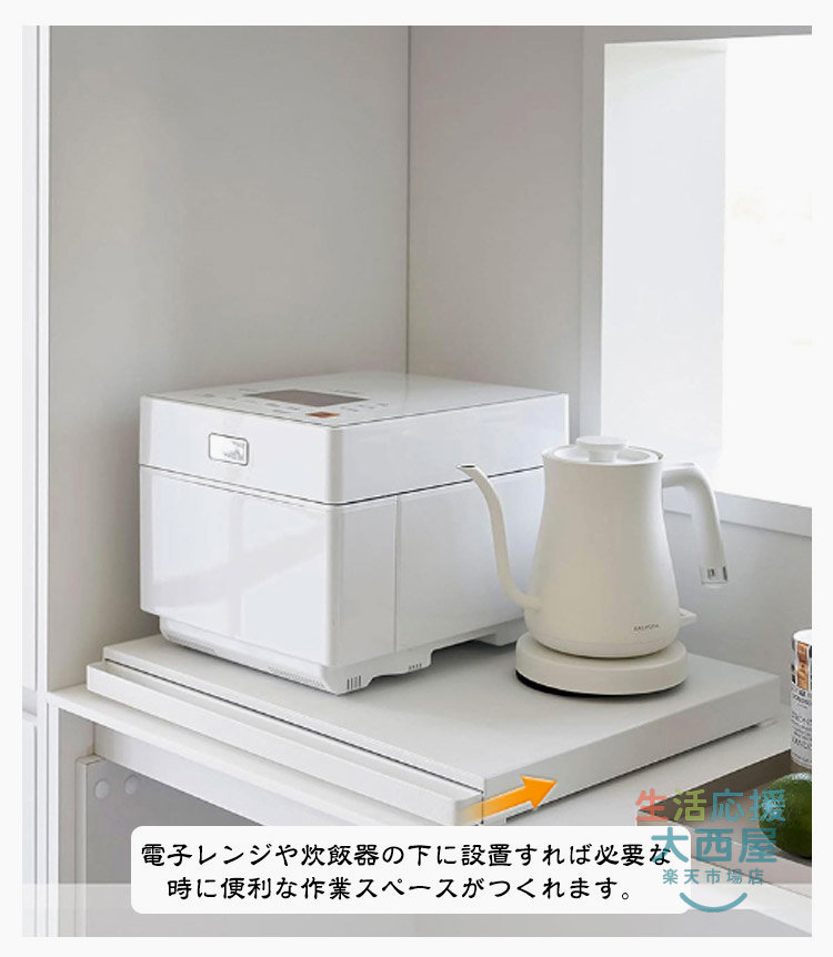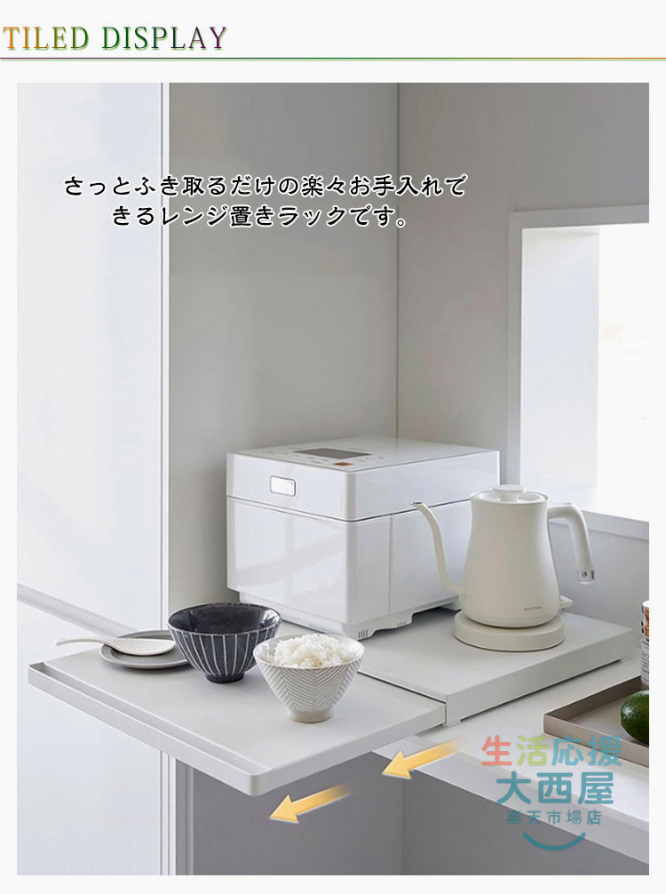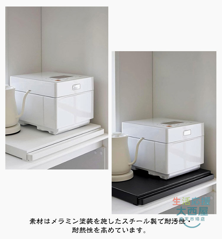 電子レンジや炊飯器の下に設置可能な伸縮式ラック。広々トレーで作業スペースとして活用でき、必要な時だけ引き出せる省スペース設計。メラミン塗装スチール製で耐汚性・耐熱性に優れています。