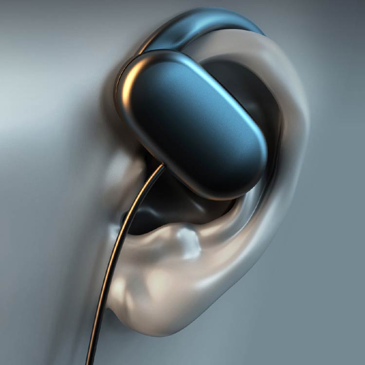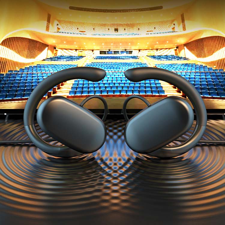 【耳を塞がない】負担なく使えるオープンイヤーイヤホン。従来のイヤホン特有の聞き疲れや耳の中の蒸れによる不快感がなく、長時間使用しても疲れにくい。空気伝導を採用したため、骨伝導イヤホンより違和感が少なく、骨伝導で聴きなれない方にはぜひこちらの空気伝導イヤホンがおすすめです。