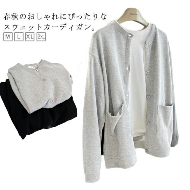 レディース 長袖 スエット トップス クルーネック カーデ 羽織り スウェット 秋アウター 秋服 丸首 前ボタン ポケット付き スウェットカーディガン 大きいサイズ トレーナー
