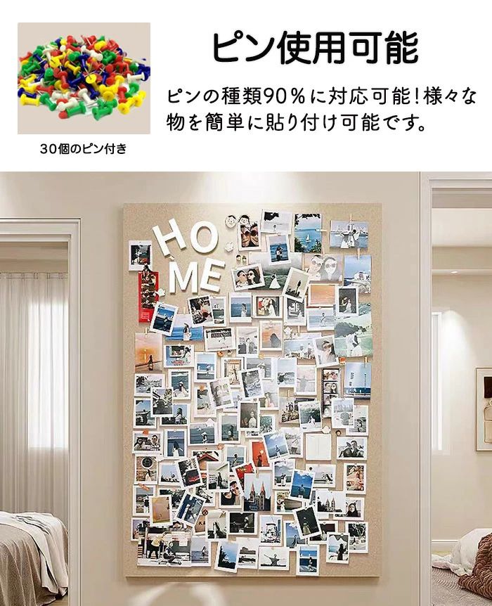 ウェルカムボードや伝言板、スケジュールボードとしても最適で、画鋲付きで簡単に写真を固定できます。