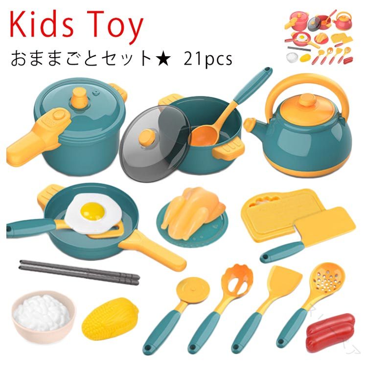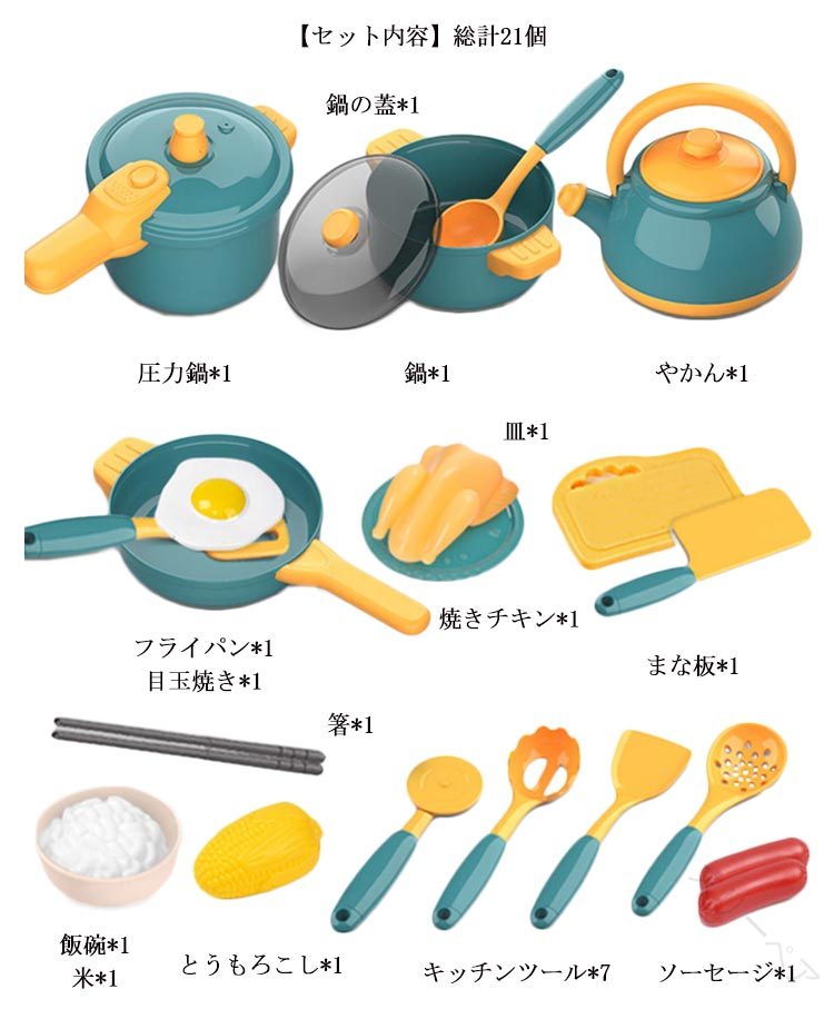 【商品名】おままごとセット【素材】 プラスチック【サイズ】F 総計21個【対象年齢】3歳から【特徴】お子様の知育に♪子供用キッチンおもちゃ、ままごと料理セット!フライパン・鍋等がセットになっていて、パパ&ママと一緒に遊びながらお料理の勉強ができます。子供がお宅で楽しく遊べる!【セット内容】総計21個(圧力鍋*1、鍋*1、鍋の蓋*1、やかん*1、フライパン*1、目玉焼き*1、焼きチキン*1、キッチンツール*7、箸*1、飯碗*1、米*1、とうもろこし*1、ソーセージ*1、まな板*1、皿*1)【注意点】・ご覧いただくモニター・パソコン・周辺機器などの違いにより、画像と実際の商品の色が異なる場合がございます。・リニューアルに伴い、パッケージ・内容等予告なく変更する場合がございます。予めご了承ください。・対象年齢未満のお子様には絶対に与えないでください。事故防止のため必ず保護者のそばで遊んでください。