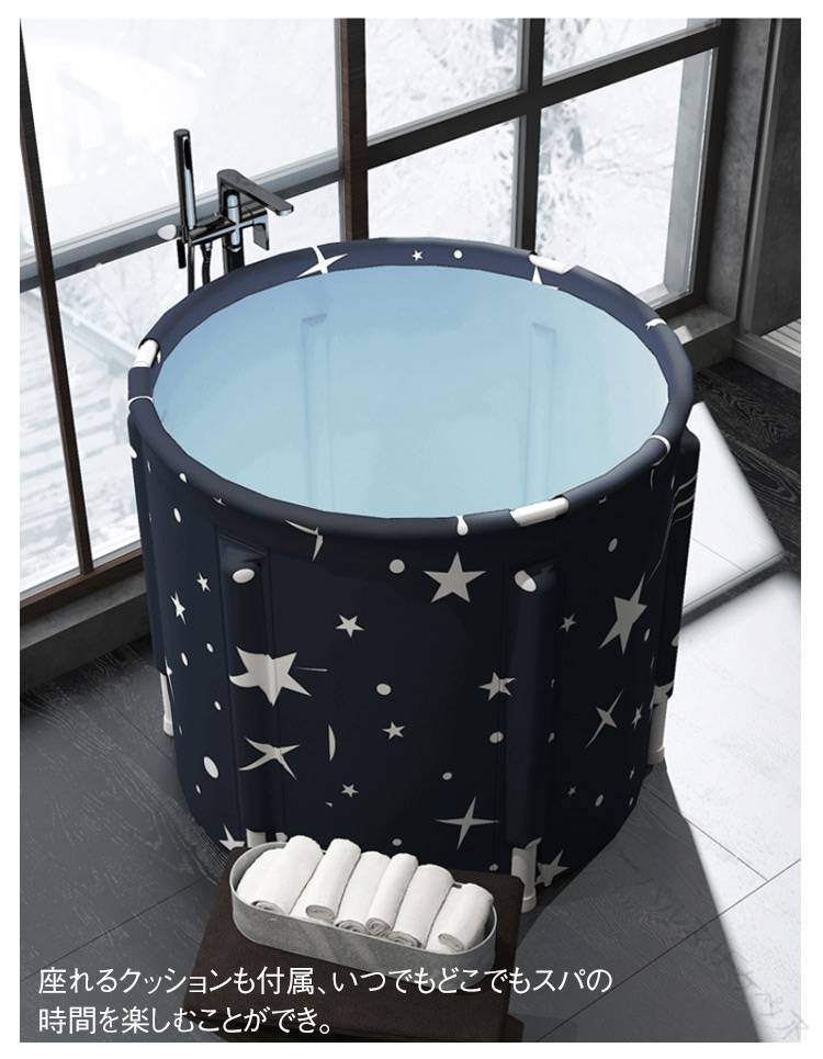 浴槽がないお家でも、お湯に浸かるバスタイムが可能!屋内および屋外、小さなスペースでも手軽に入浴できる。夏は子供の折りたたみプール・ビニールプールとしても使えます。多層構造で防水性や保温性に優れた、お湯に浸かる至福のバスタイムが可能。持ち運び可能で、使わない時はコンパクト収納できるので省スペース♪水を抜くための排水口は底と側面の2か所にあるので、水抜きもカンタン!座れるクッションも付属、いつでもどこでもスパの時間を楽しむことができ。おうちのシャワールームや水遊び、災害時、アウトドアにもオススメです。