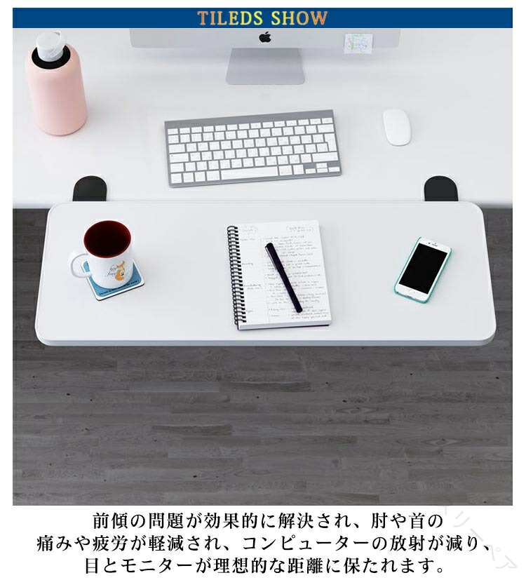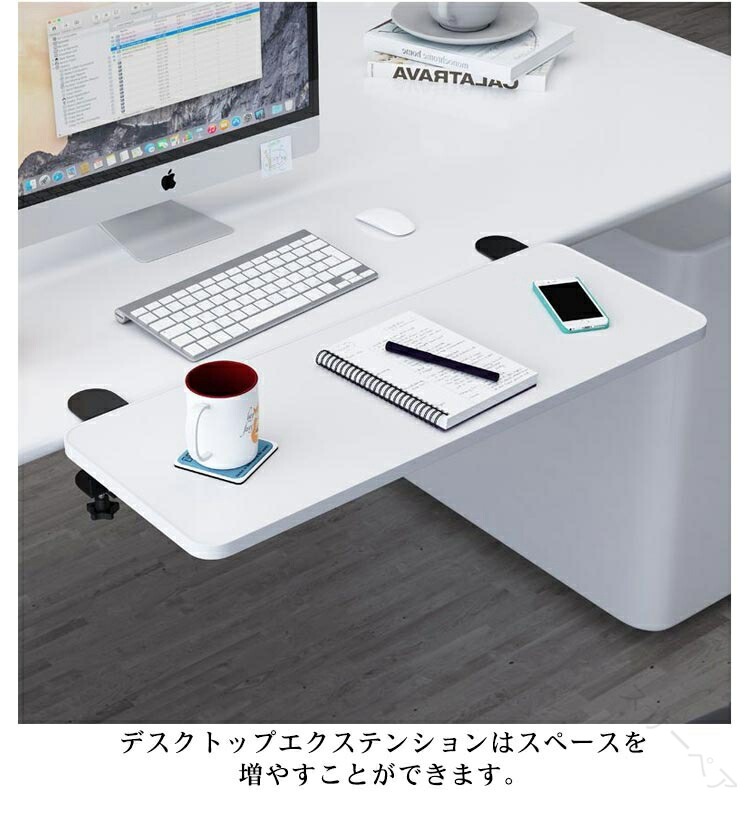 腕、キーボード、マウスをその上に置くのは非常に快適です。前傾の問題が効果的に解決され、肘や首の痛みや疲労が軽減され、コンピューターの放射が減り、目とモニターが理想的な距離に保たれます。デスクトップエクステンションはスペースを増やすことができます。90°に折り畳んでテーブルの下に隠して、コンパクト収納できます。穴開け必要なく、クランプ式でネジを取り付けるだけで使えます。