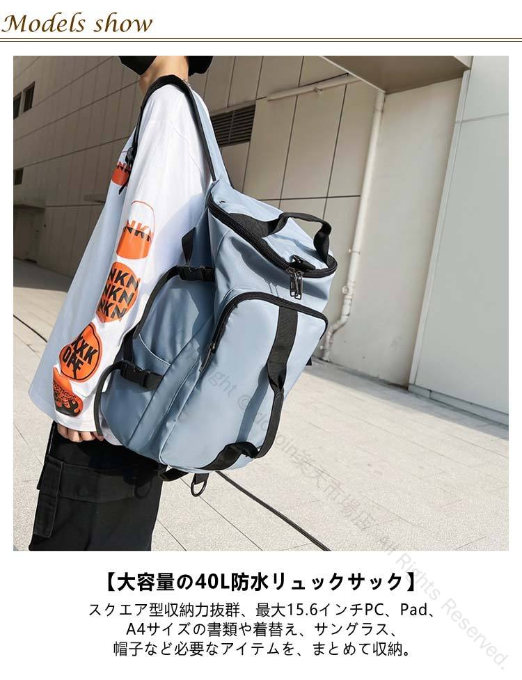 登山リュックサック背負う/肩掛け/手提げ3WAY40Lの大容量! 多機能 撥水加工【大容量の40L防水リュックサック】スクエア型収納力抜群、最大15.6インチPC、Pad、A4サイズの書類や着替え、サングラス、帽子など必要なアイテムを、まとめて収納。キャンプや登山道具、旅行なら2~3泊分の荷物が余裕で入り、タウンユースだけでなく、非常時持ち出し用の防災リュックとしても十分ご活用いただけます。【耐久素材を採用】表面は丈夫な高密度オックスフォード防水生地で、引っ張りや摩擦に強い、伸び縮みがなく、大切な荷物を守りたいから、防水性能だけでなく高い耐久性を実現しました。【人体工学なデザイン】 衝撃を吸収する緩衝材入りの肉厚ベルトは体との一体感を高め、長時間荷物を持ち歩いても肩を痛めません、疲労を緩和します。肩と背中の負担を効果的に分散させ、背負う時の圧力を軽減し、肩ずれも防止できます。【3WAYビジネスバッグ】このリュックサックは斜め掛けや手提げができ、ワンショルダーストラップが付いています、出張通学旅行など様々なシーンに合わせてご活用いただけます。