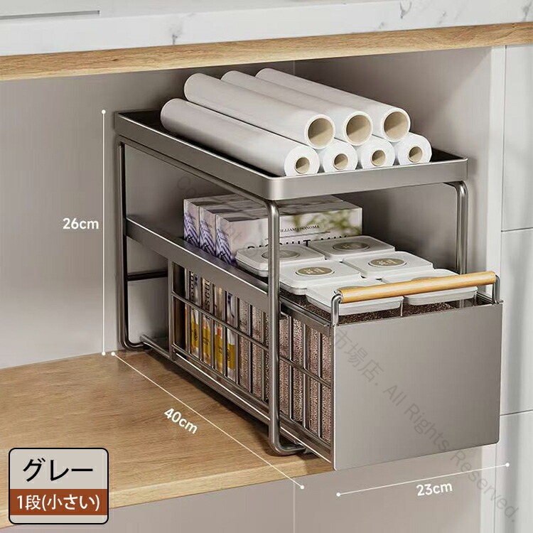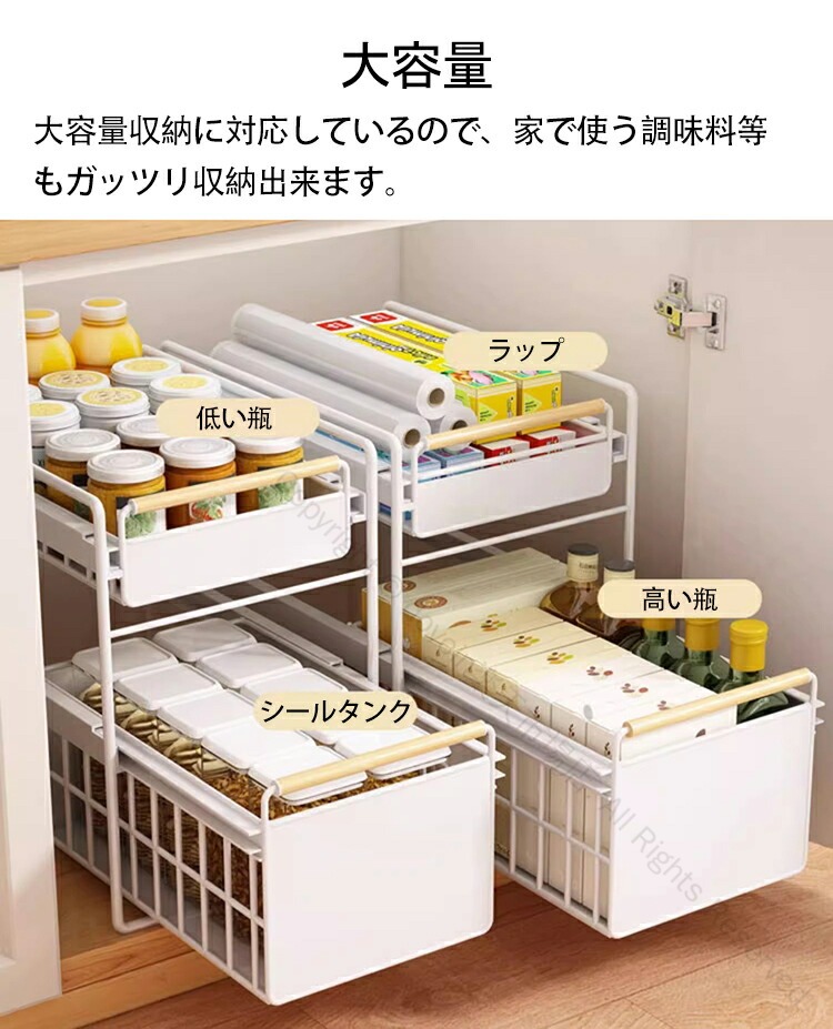 商品コード:y308170カラー:ホワイト、ブラック、グレーサイズ:1段(小さい)/40*23*26cm、1段(大きい)/40*28*26cm、2段(小さい)/40*23*39cm、2段(大きい)/40*28*39cm材質:炭素鋼【ガイド】※片手でシュッと伸縮可能な「魔法のレール仕様」:特殊ベアリング採用で、重い食器を入れてもスムーズ動作!※天然木の丸みハンドル:角のないデザインでお子様のいるご家庭も安心です。※厚いステンレスフレーム:重い鍋を3段重ねてもビクともしない耐久性!安定した収納ラックで、スライドしてもグラグラしにくく使いやすい。※大容量収納:シンク下のデッドスペースを有効活用出来るラック。大容量収納に対応しているので、家で使う調味料等もガッツリ収納出来ます。【注意事項】※万一在庫切れの場合はご了承ください。※商品の色及びサイズは、撮影状況やPC環境により多少異なって見える場合がございます。※サイズ数字は目安です。商品により若干の誤差がございます。