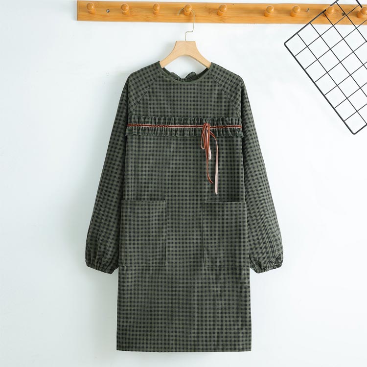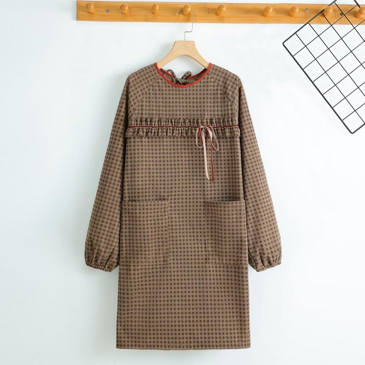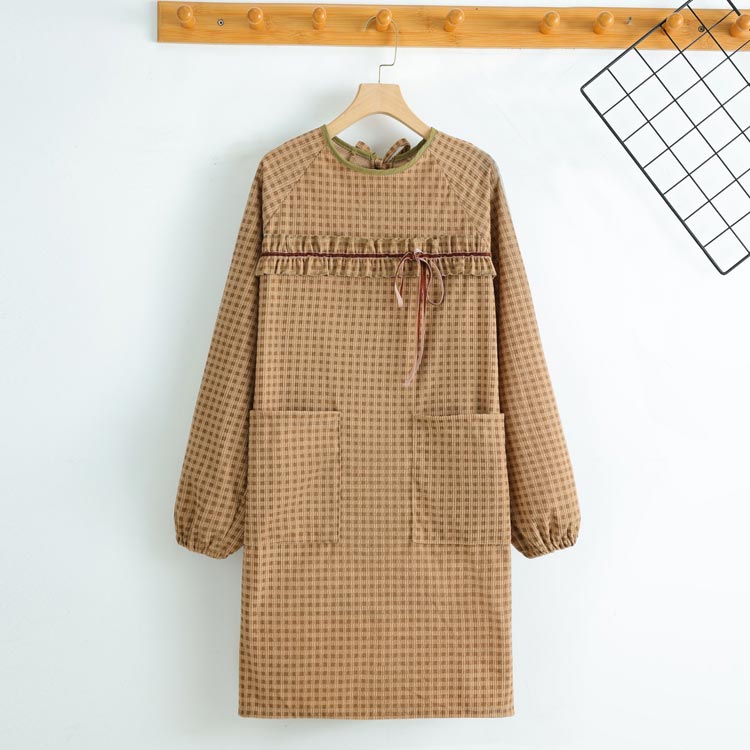 割烹着かっぽう着おしゃれスモック大人用コーデュロイエプロン長袖袖付きレディース可愛いフリルポケット付きロング大きいサイズ袖ゴム入り北欧秋冬あったか暖かい防汚キッチン家事掃除