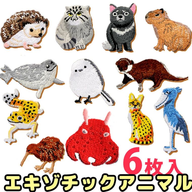 6枚入 アイロンワッペン 可愛いエキゾ 日用品雑貨 文房具 手芸 豊富 シマエナガ キウイ ハシビロコウ マヌルネコ ハリネズミ アザラシ カピバラ ハコフグ タスマニアデビル メンダコ サーバルキャット ヒョウモントカゲモドキ カワウソ ランダム(お楽しみ)