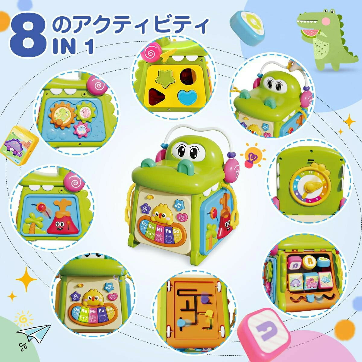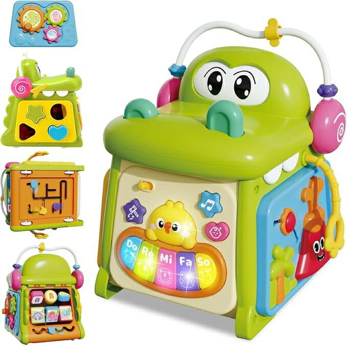 豊富な遊びの知育玩具:このアクティビティキューブは、鍵盤楽器、知育時計、形合わせ、ルーピングなど、8つの面に18種類の遊びが詰まっています。赤ちゃんの成長に合わせて脳を育むことができ、はいはい期から3歳頃まで楽しめる知育玩具です。