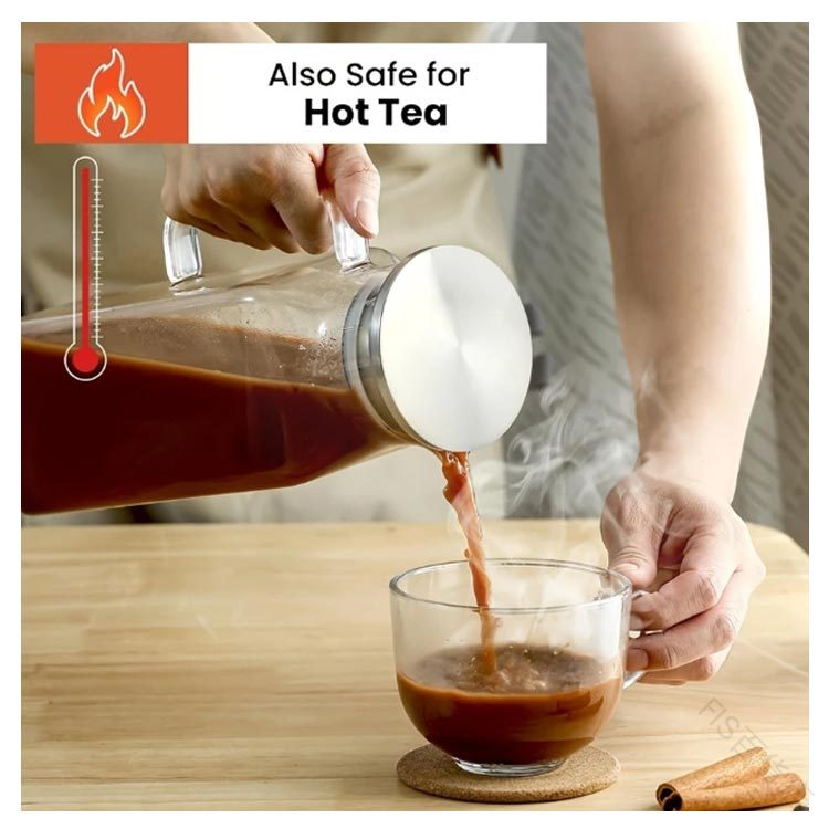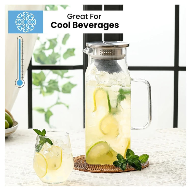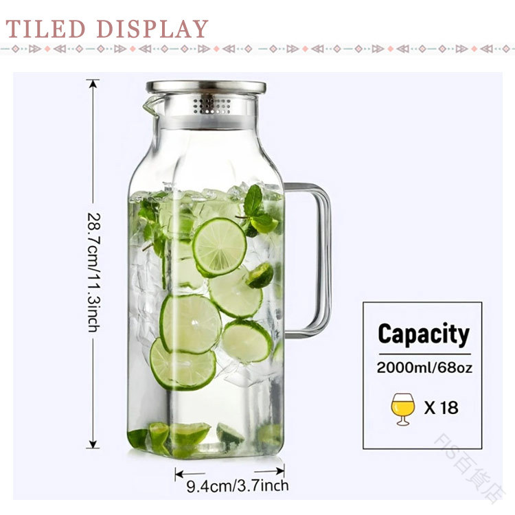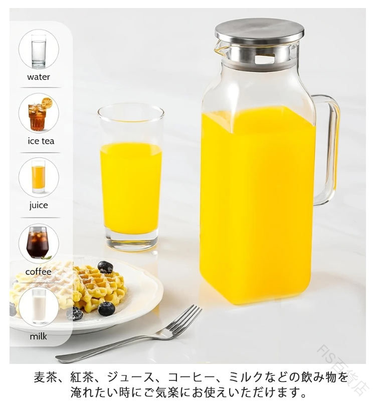 角型で冷蔵庫のスペースを有効活用2Lガラスピッチャー。ステンレス茶こし一体型蓋!ボトルの口径が大きく、手が直接差し込めて清潔できます麦茶、紅茶、ジュース、コーヒー、ミルクなどの飲み物を淹れたい時にご気楽にお使えいただけます。-30℃~150℃、耐熱ガラスので、温かい飲み物にも冷たい飲み物にも使える耐熱ガラス製のピッチャーです角型のサーバーは冷蔵庫に収納した際にムダなくスッキリみせてくれます。