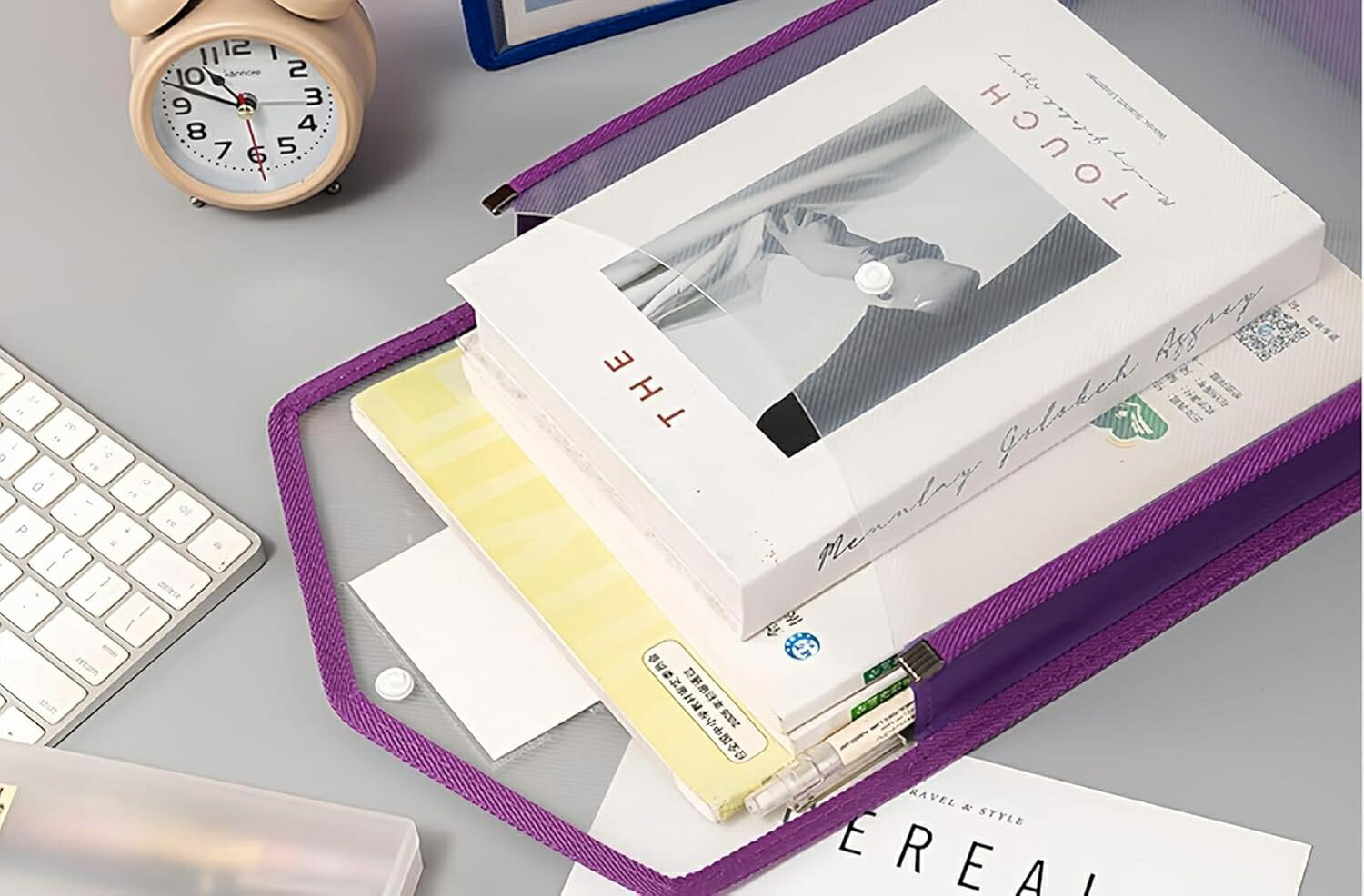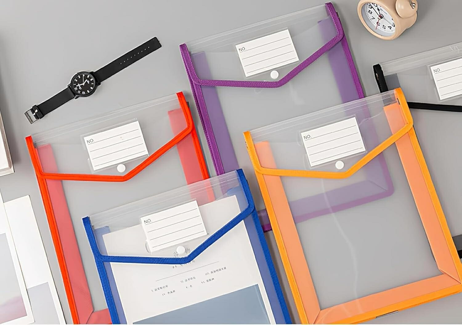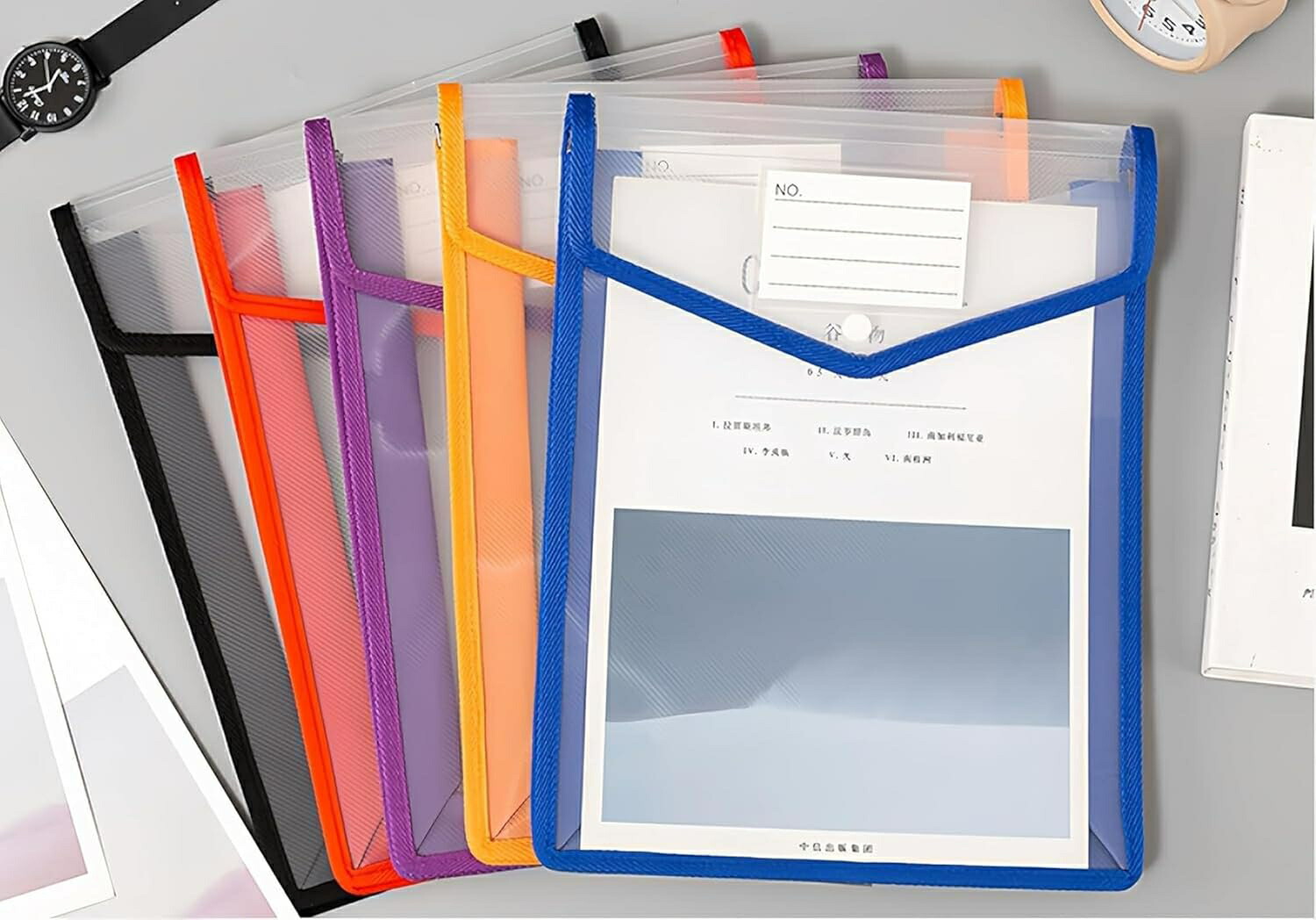【おしゃれで実用的な5色セット】 シンプルでスタイリッシュな赤・青・黒・オレンジ・紫の5色セット。透明なデザインで中身が見やすく、どんな場所でも使いやすいアイテムです。色分けして分類すれば、必要な書類をすぐに取り出せるので、時間の節約にもつながります