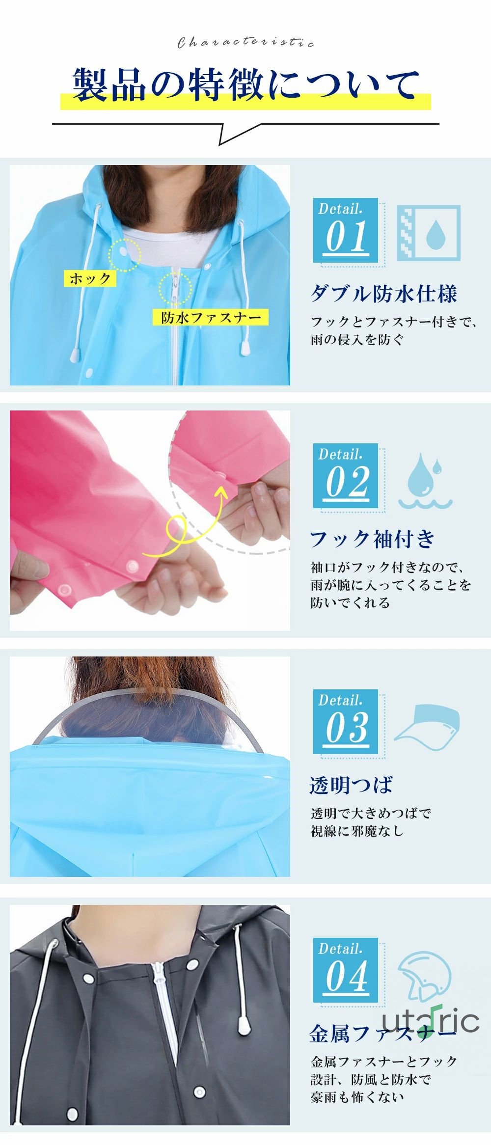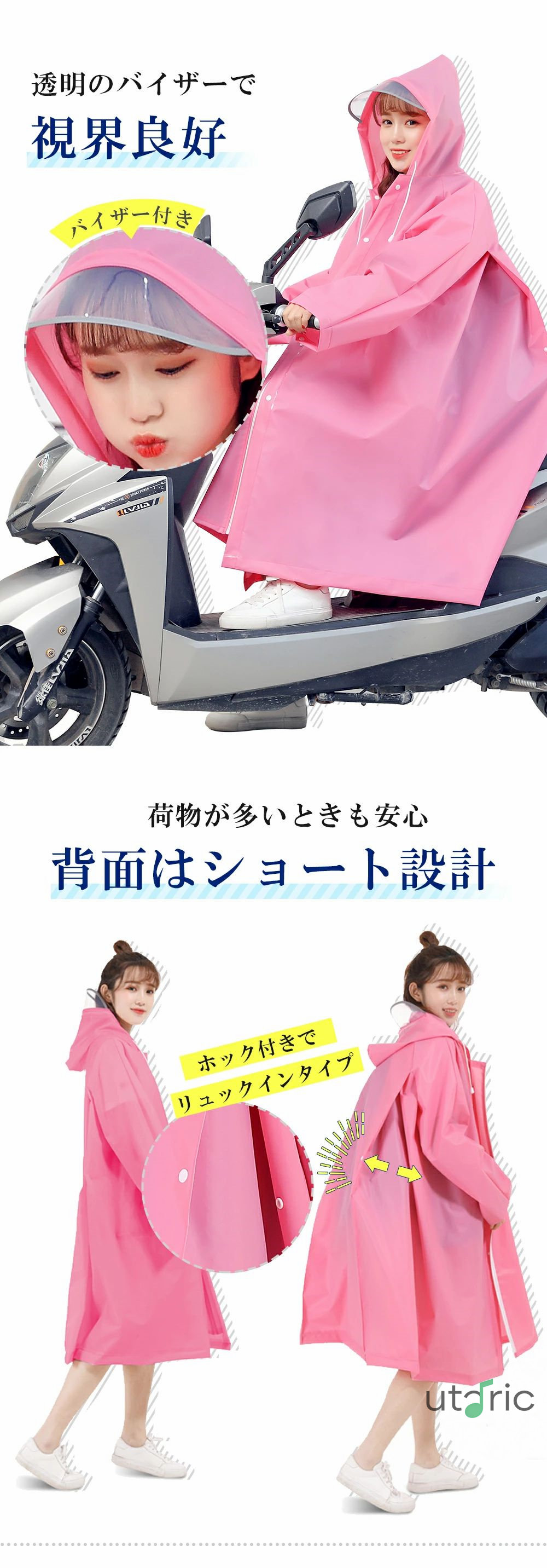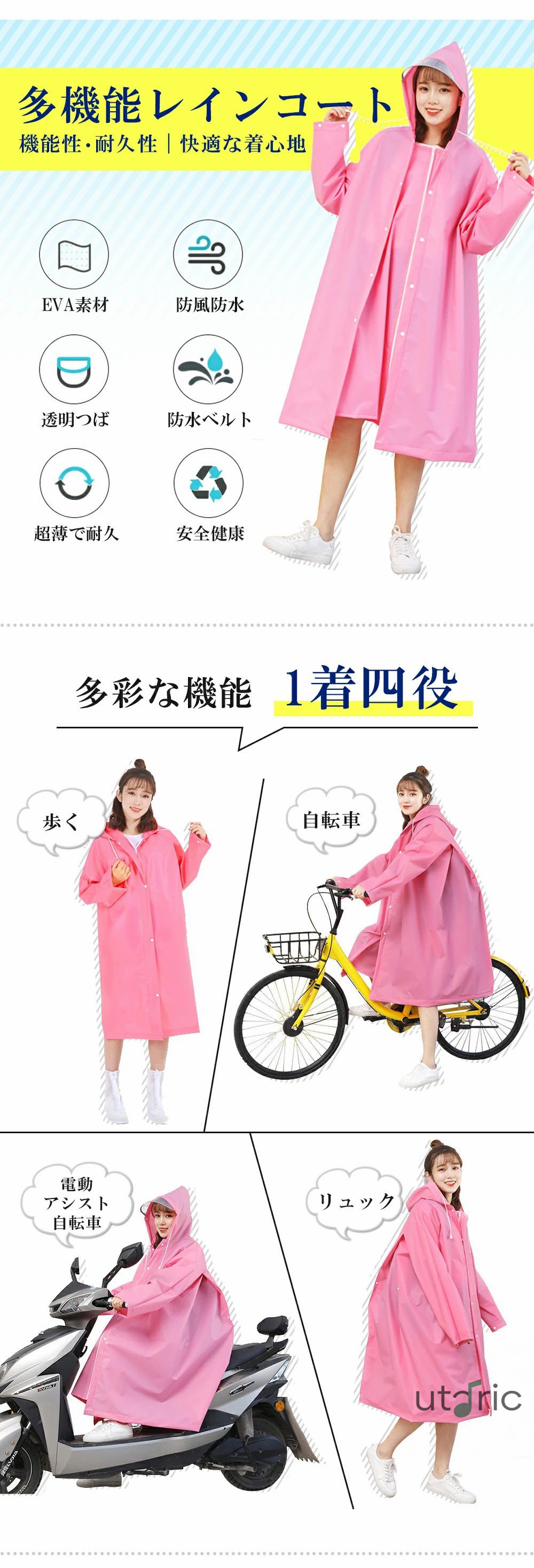 【多機能ロング丈レインコート】自転車、歩行、リュックに対応できる男女兼用のレインコートです。膝下までカバーするロング丈、体がしっかり覆われ、レインブーツを履けば足元まで濡れにくく、全身を雨から守ることができます。レインコートの後にはスナップボタンを採用し、普段はボタンを付けて使用できますが、ボタンを外すとかなり余裕のある大きめサイズに変更、リュックやバッグを背負ったままでもゆったりと着れます。通勤通学はもちろん、自転車に乗る時や、雨中での作業時にも邪魔せず、台風、梅雨季節に役に立ちます。