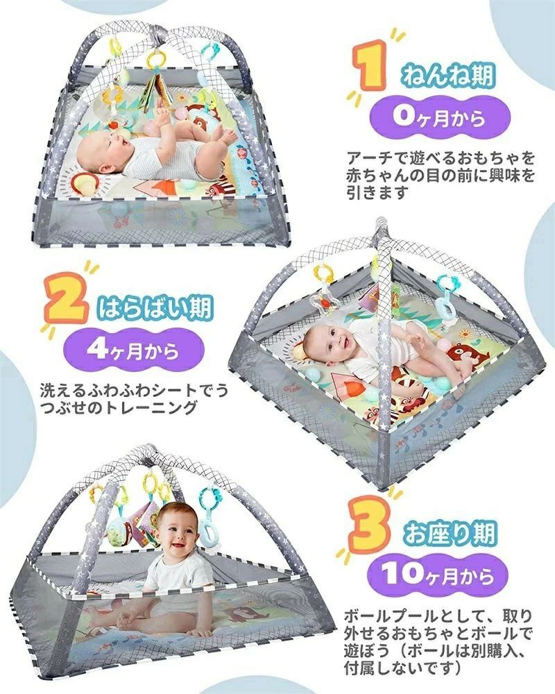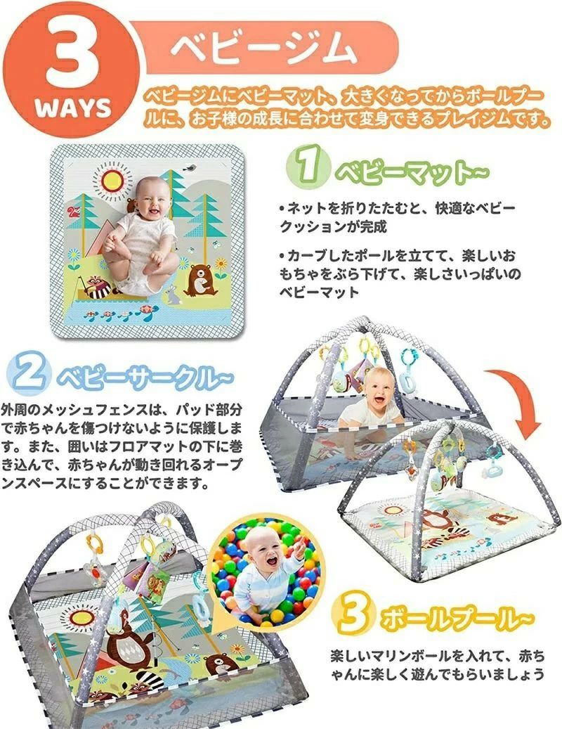 プレイジム・ ベビーサークル・ ボールプールなどの三つの機能が備えています。プレイマットの四辺を立ち上げ、カラフルなボールを入れるとボールプールに大変身します(注意:ボール別購入、付属しないです)ベビープレイマットとして、お昼寝の際にもぴったりです、ママは暇がないとき、ベビーサークルで使うことに最適です。