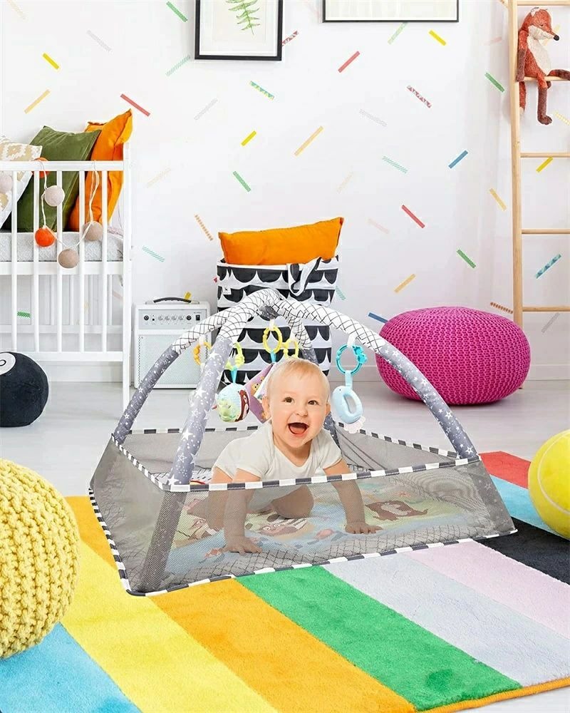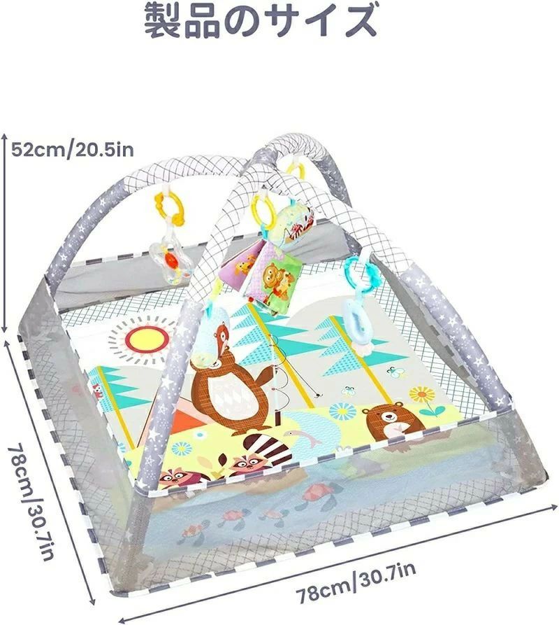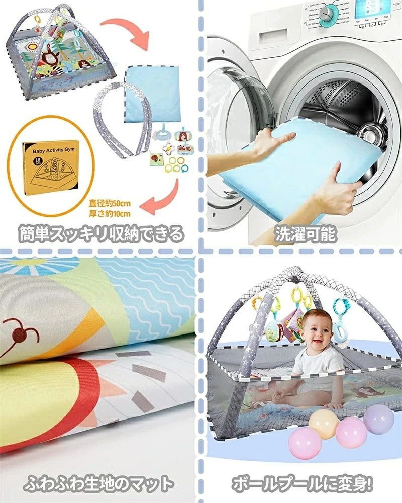ベビージムは四隅にアーチをセットするだけで組み立て簡単です、ベビープレイマットは洗濯機で洗えるので、汚れても安心でいつも清潔な状態を保つことができ安心して遊べます!