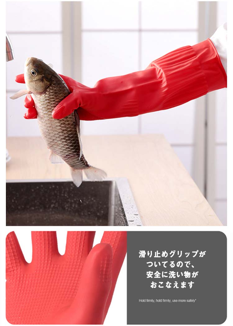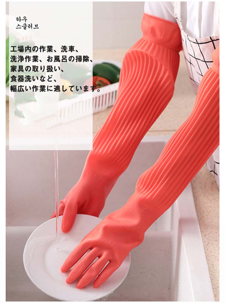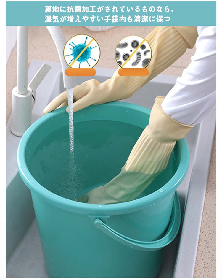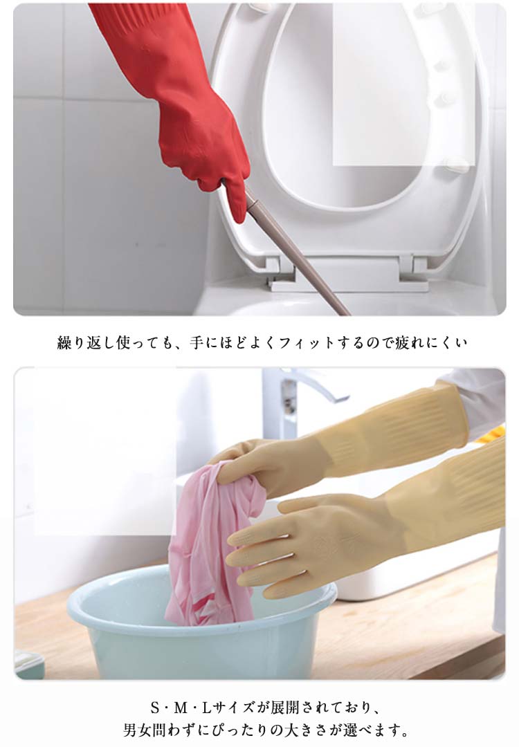 このゴム手袋は一般的な長いタイプの手袋です。手首から腕までしっかりと保護し、作業時や清掃時に非常に便利です。滑り止めグリップがついてるので、安全に洗い物がおこなえます。裏地に抗菌加工がされているものなら、湿気が増えやすい手袋内も清潔に保ちます。繰り返し使っても、手にほどよくフィットするので疲れにくいです。S・M・Lサイズが展開されており、男女問わずにぴったりの大きさが選べます。工場内の作業、洗車、洗浄作業、お風呂の掃除、家具の取り扱い、食器洗いなど、幅広い作業に適しています。