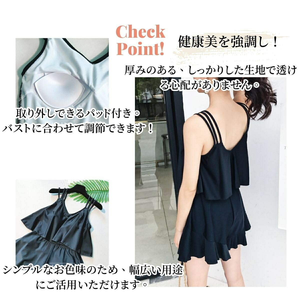 オールインワンタイプなのでお腹は絶対見えない、プールや海で水着を着たいけど、お腹を出すのはイヤ!揺れる可愛いフレアスカートで気になるヒップも太ももしっかりカバーして、女性の気になる部分のお悩みを解決、おしゃれしながら体型カバーワンピース!