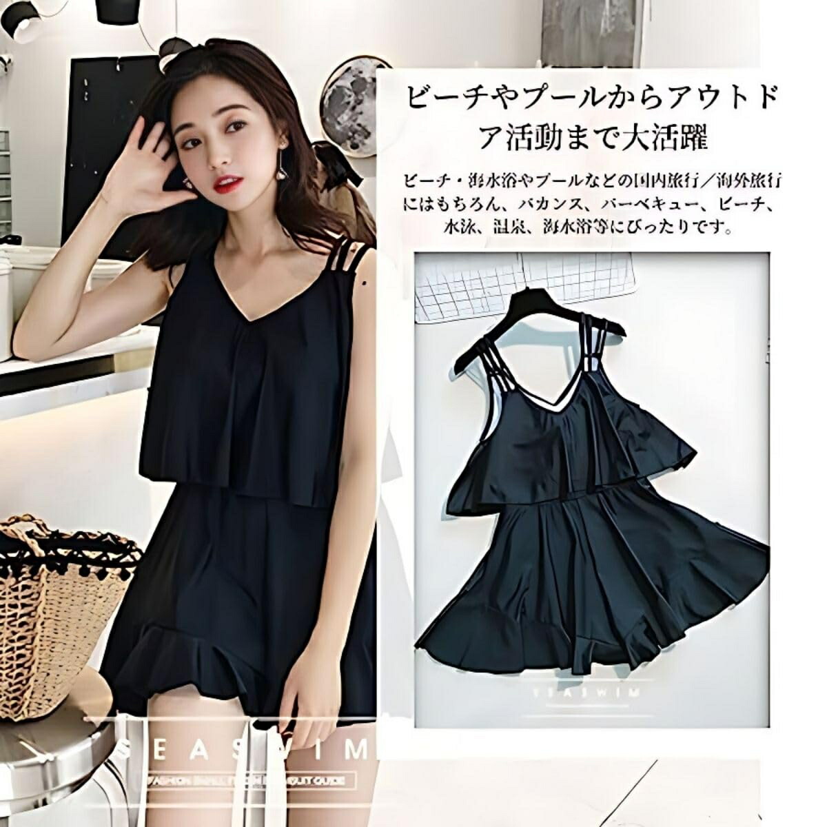 水着 レディース 体型カバー ワンピース オールインワン オフショルダー フレア 大きいサイズ 無地 ブラック SWIMWAER 女性用水着