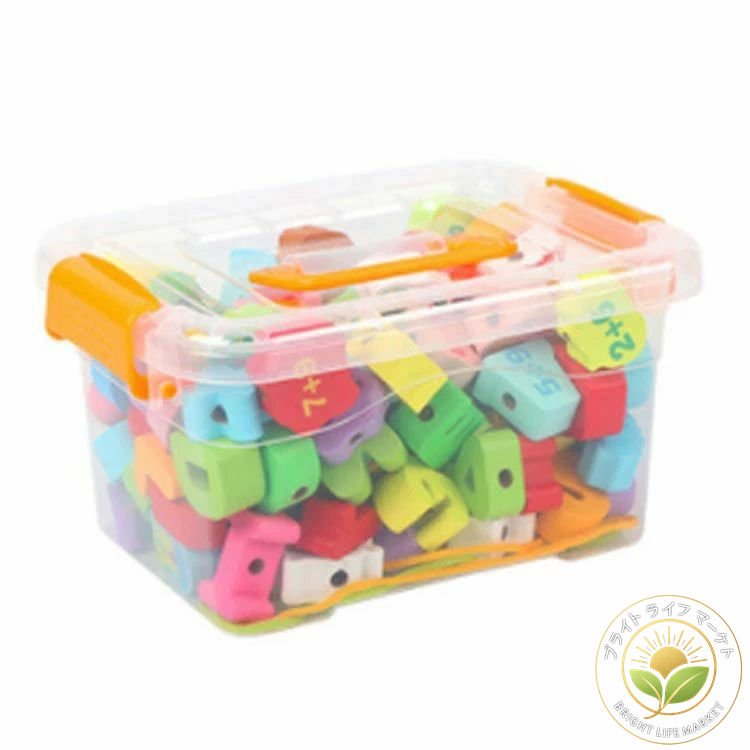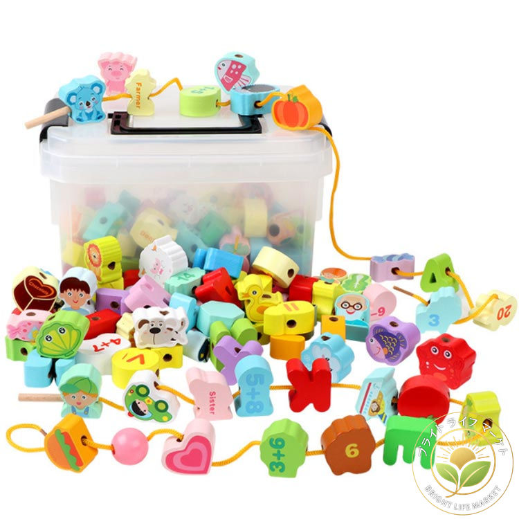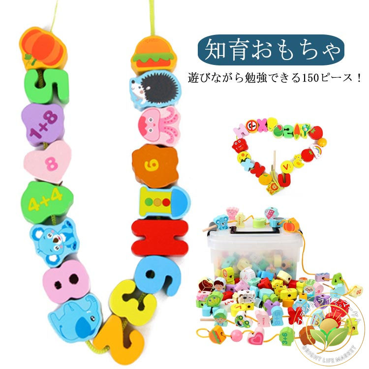 木製 紐通しおもちゃ 150pcs 150個 ひも通し ブロック 収納ケース付き 木製おもちゃ 紐通し 木のおもちゃ 知育 知育おもちゃ 脳トレ 子供 指先の知育 絵柄 英語勉強 セット カラフ 数字
