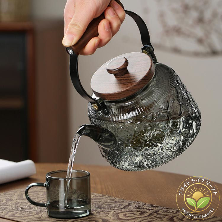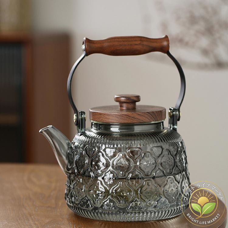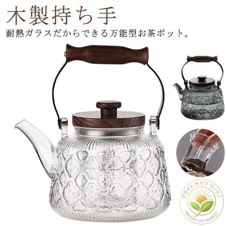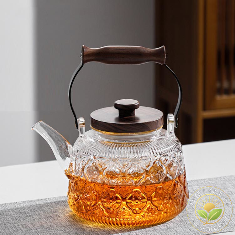 海棠花 耐熱ガラス ティーポット 茶こし付き ガラス製ポット 1000ml 木製持ち手 ガラス急須 紅茶ポット フルーツティー 花茶 工芸茶 ハーフティー 煮茶 健康茶器 直火可 蒸茶