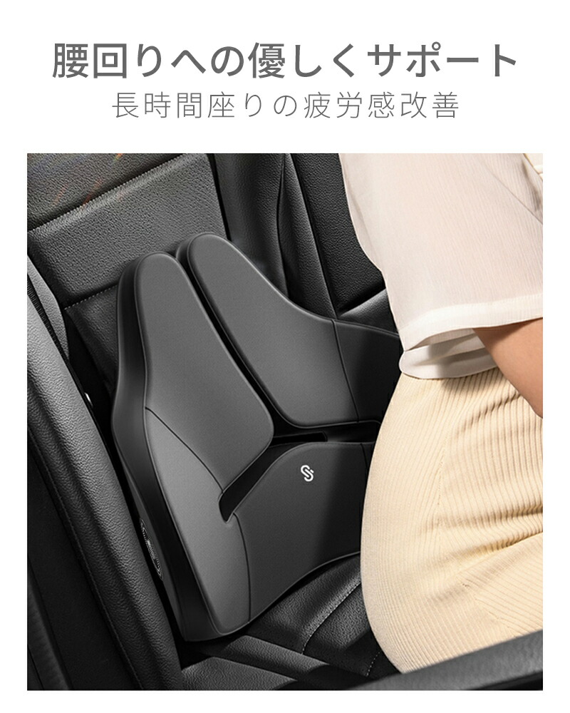 メリット2【腰クッションの3つのメリット】正しい姿勢をキープ クッションは腰部を両サイドから包み込んで美しく良い姿勢をキープできる。座りがちな疲労感の緩和 クッションは腰への負荷を吸収して分散して疲労感を緩和できる。リラックスな長キロ運転 腰のカーブにフィットしてサポートしてくれ、体からの圧迫感を軽減し長時間の着座でも快適に運転できる。