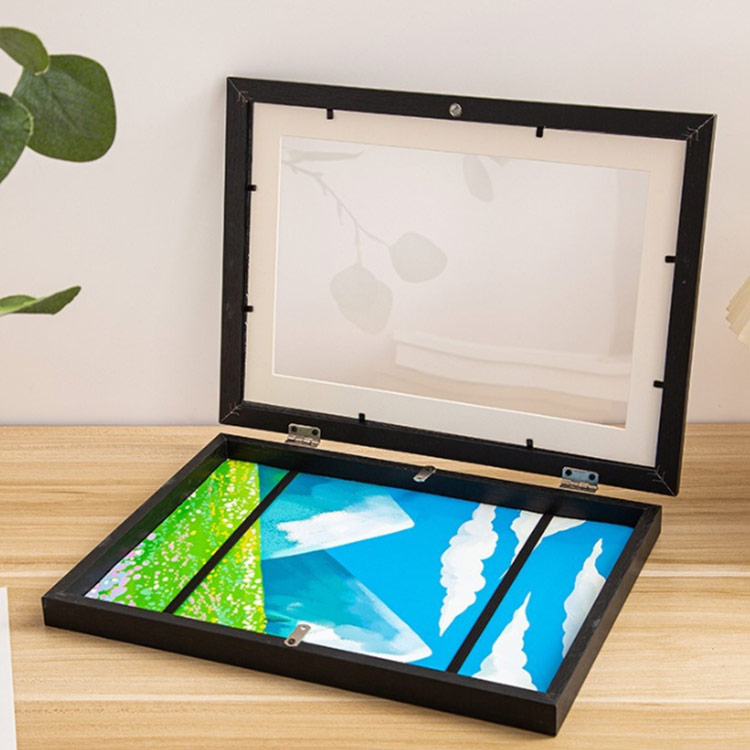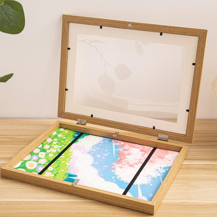 【大容量収納額縁】収納しながら作品をディスプレイ~A4サイズ紙が50~150枚ぐらい保管可能。アートフレームは厚みがあって、立体的な作品も納められます。ゴムベルトがあるので、作品がしっかりと固定できます。(ゴムベルトが邪魔に感じる場合、展示したい作品をホワイトマットに置き、透明テープで固定したほうがいいと思います。)