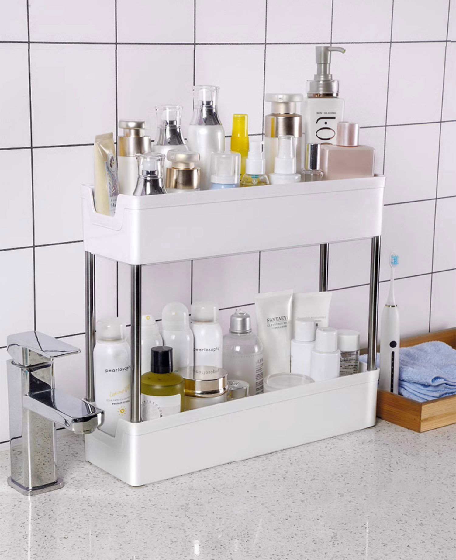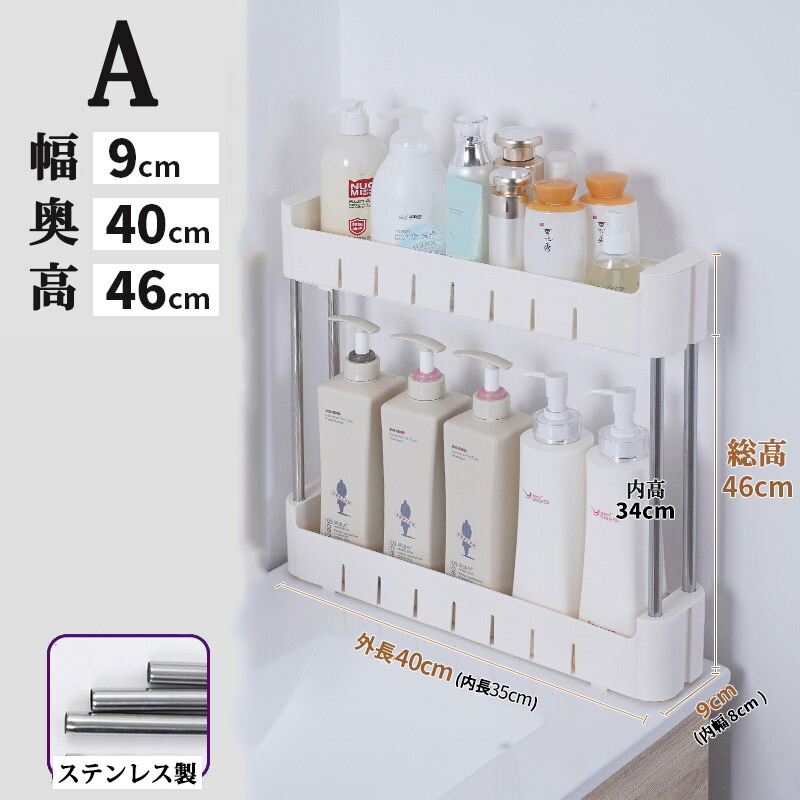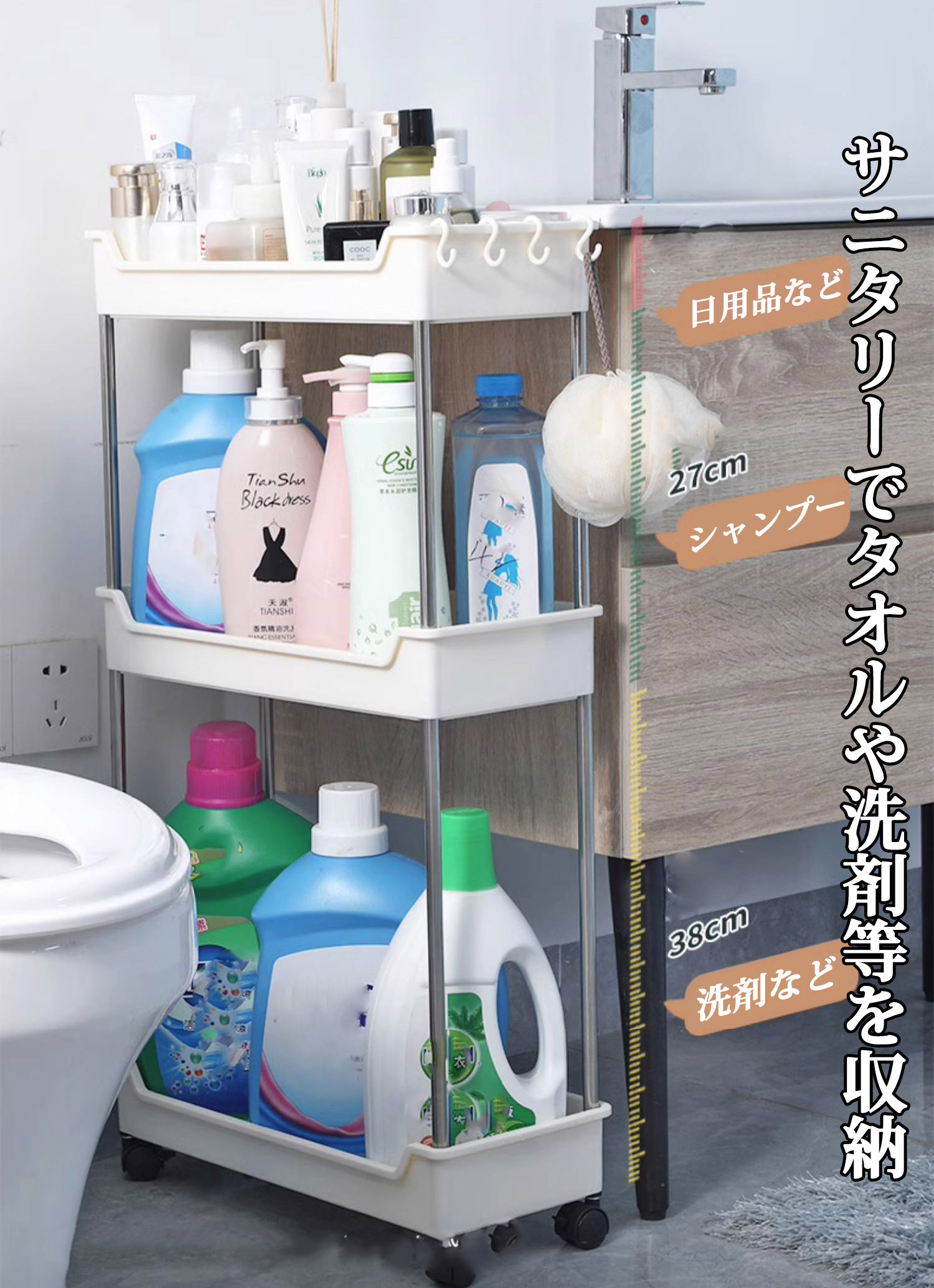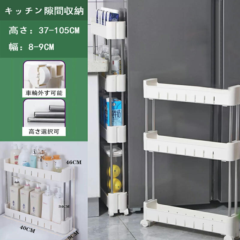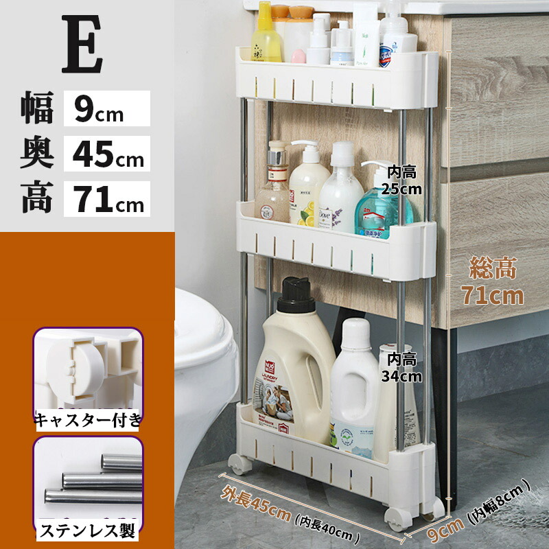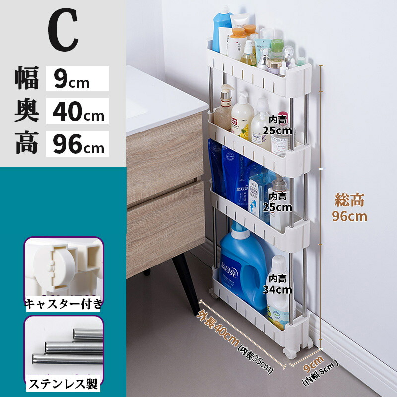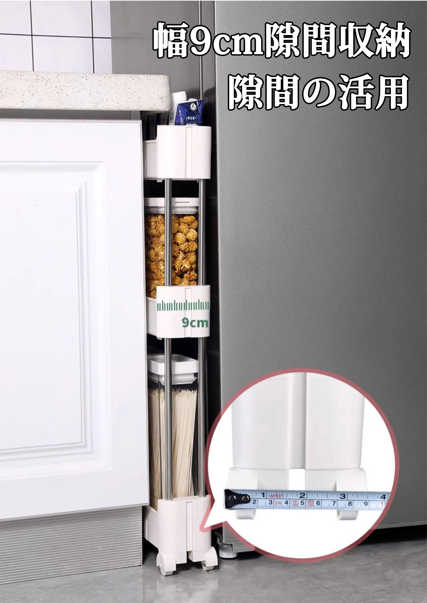 幅わずか9cmのスリムなデザインで、キッチンやサニタリーの狭い隙間にもすっきりと収まり、保存食品や雑貨、タオルや洗剤など、様々なアイテムを整理整頓できます。