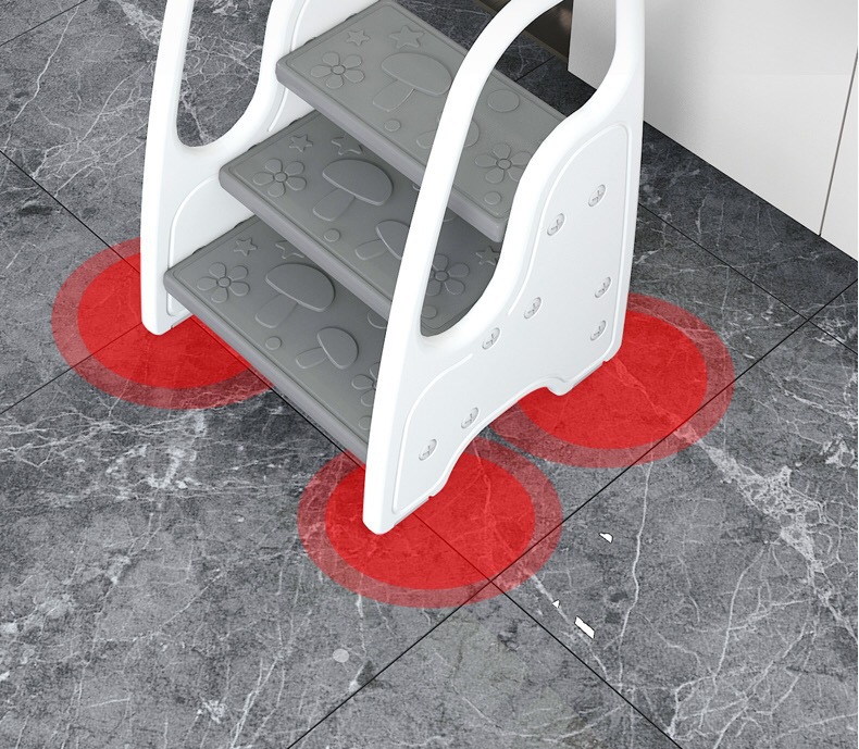 :製品の底部には大きなシリコン製滑り止めシートを4つ配置。さらに、握りやすい丸っこい手すりと、滑り止め加工が施された広い踏み台が、お子様の転倒や落下をしっかりと防ぎます。