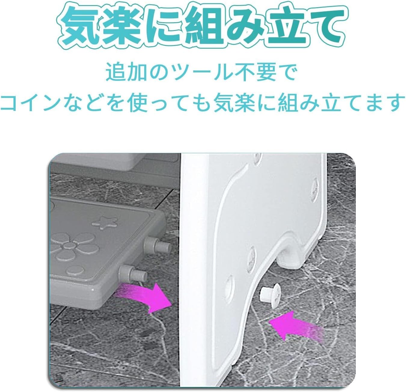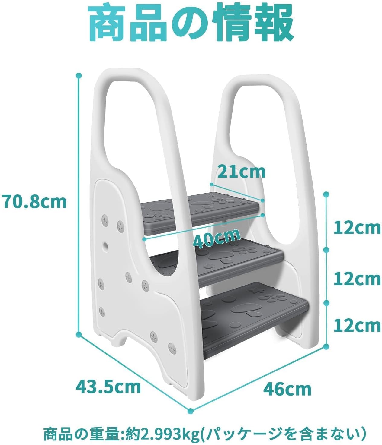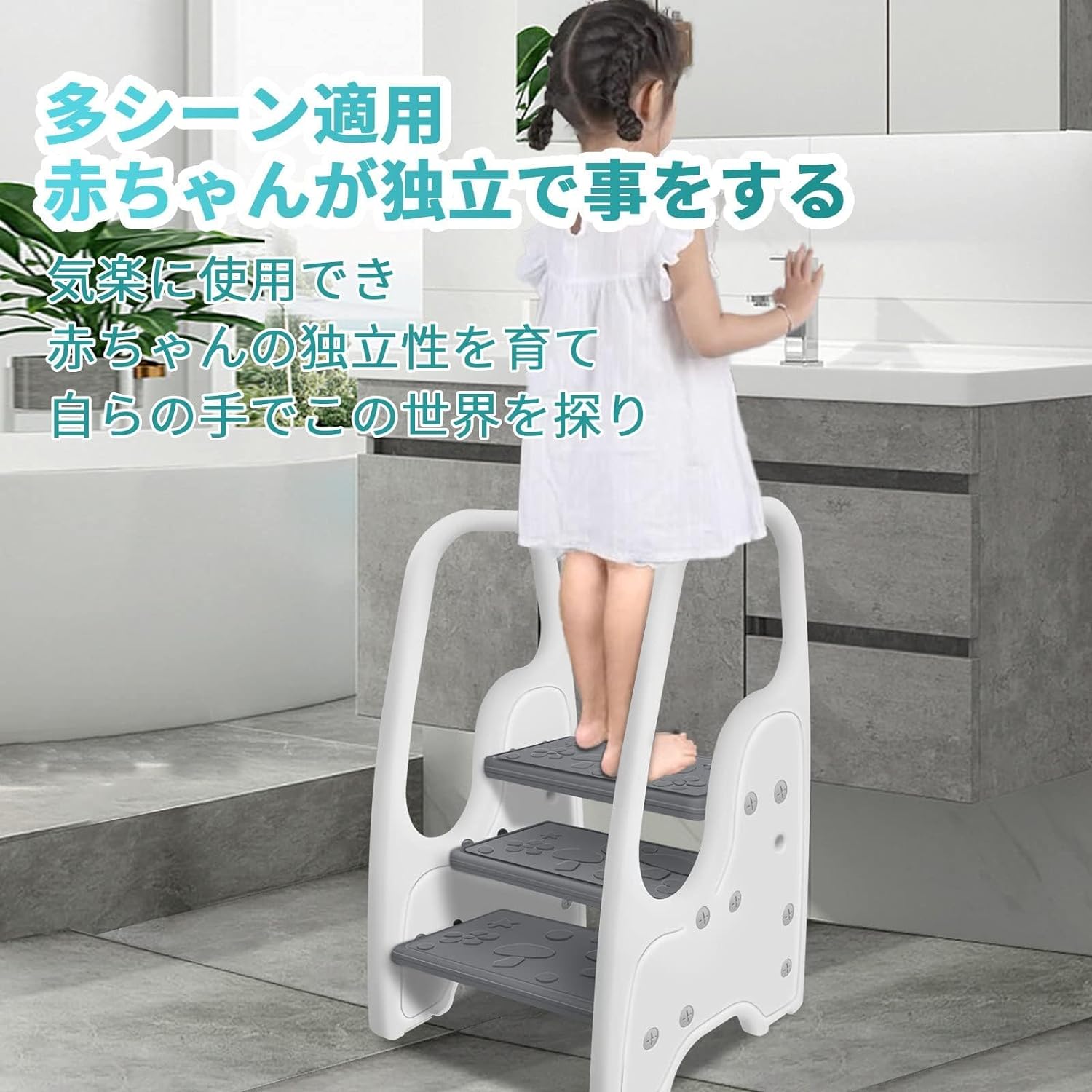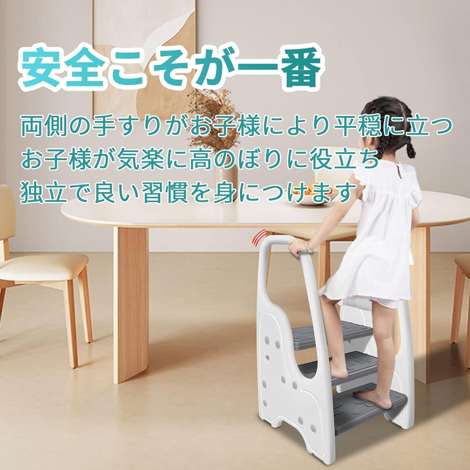 :荷重を分散させる3段式デザインと背板付きの構造で、グラグラ揺れにくく安定感抜群!水に濡れても大丈夫な素材なので、洗面所での手洗いやうがい、トイレトレーニング、キッチンのお手伝いなど幅広いシーンで大活躍します。