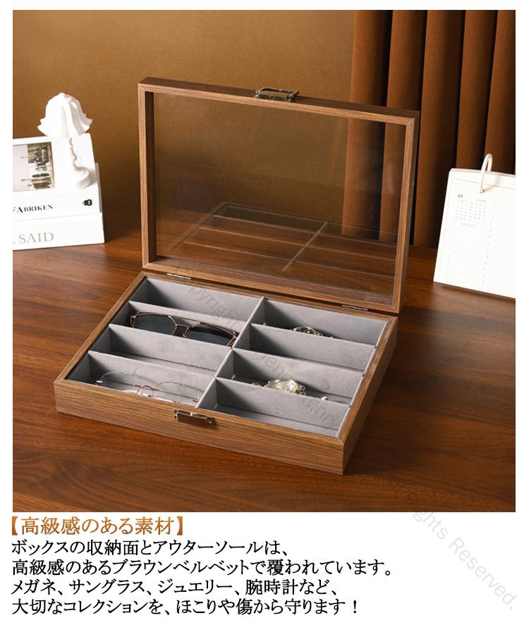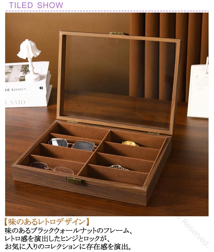 8本収納木製メガネケースレトロ感と高級感をあわせ持つデザイン【味のあるレトロデザイン】味のあるブラックウォールナットのフレーム、レトロ感を演出したヒンジとロックが、お気に入りのコレクションに存在感を演出。【高級感のある素材】ボックスの収納面とアウターソールは、高級感のあるブラウンベルベットで覆われています。メガネ、サングラス、ジュエリー、腕時計など、大切なコレクションを、ほこりや傷から守ります!【使いやすい構造】ガラス面の大きな窓でお気に入りのコレクションが良く見える。素敵なコレクションを見せる収納として。開閉はロックを外し、開けるだけ。【ちょうどいいサイズ】大きすぎず、小さすぎないちょうどいいサイズ