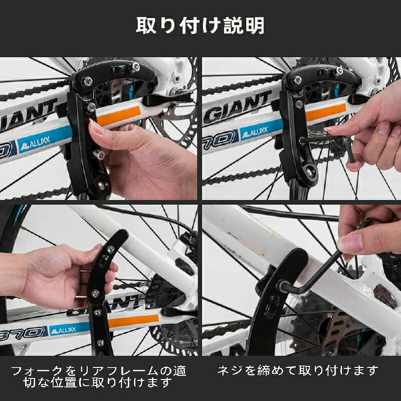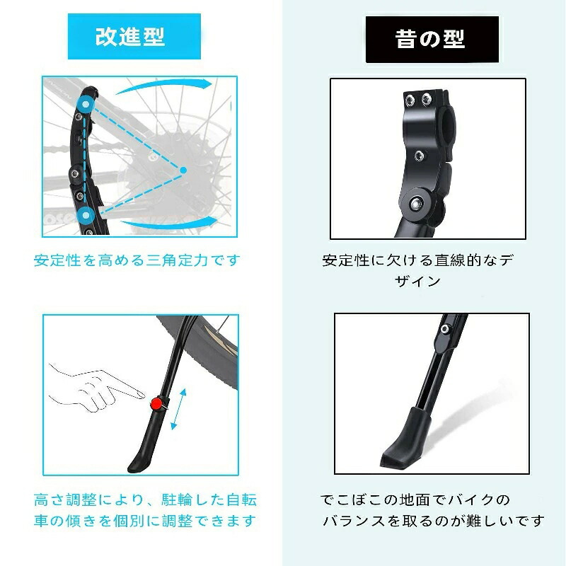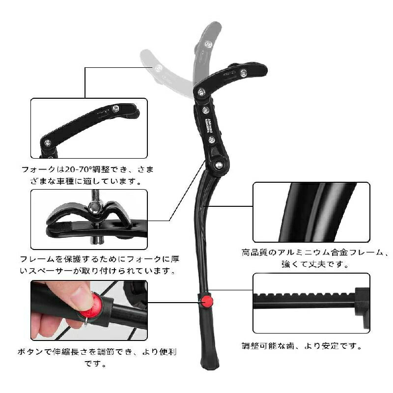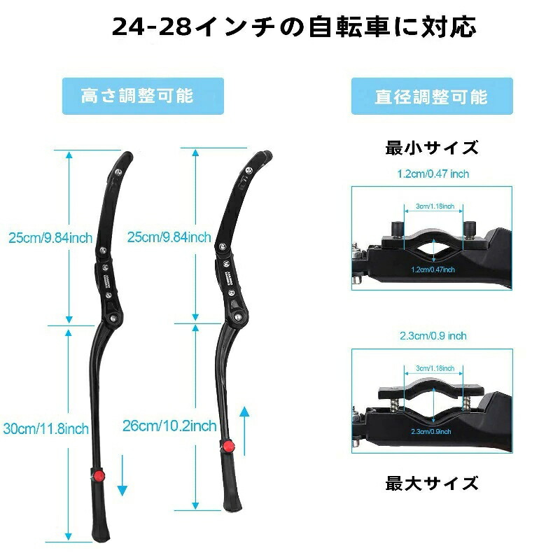 自転車 キックスタンド バイクサイドスタンド 長さ調節可能 アルミニウム合金製 二点固定 簡単取り付け 自転車用スタンド ロードバイク クロスバイク マウンテンバイクに 24-28インチ~700C対応