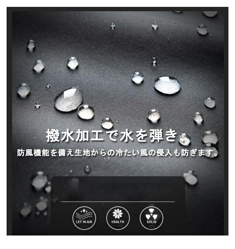 撥水加工で水を弾き、防風機能を備え生地からの冷たい風の侵入も防ぎます。