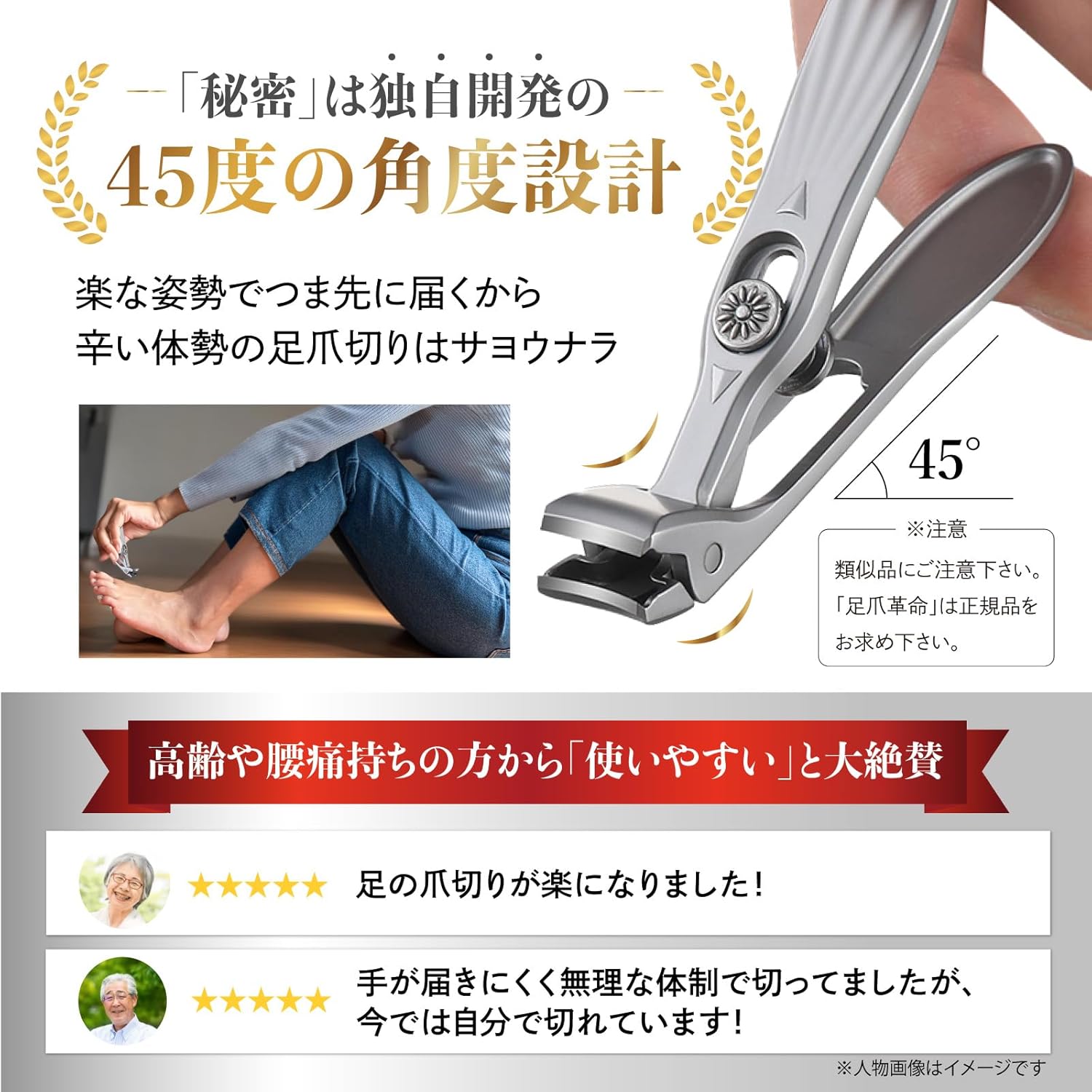 「45度の角度」が爪切りを劇的に楽にする 足用爪切り「足爪革命」誰にでも簡単キレイにカット出来る爪 切りニッパーです。