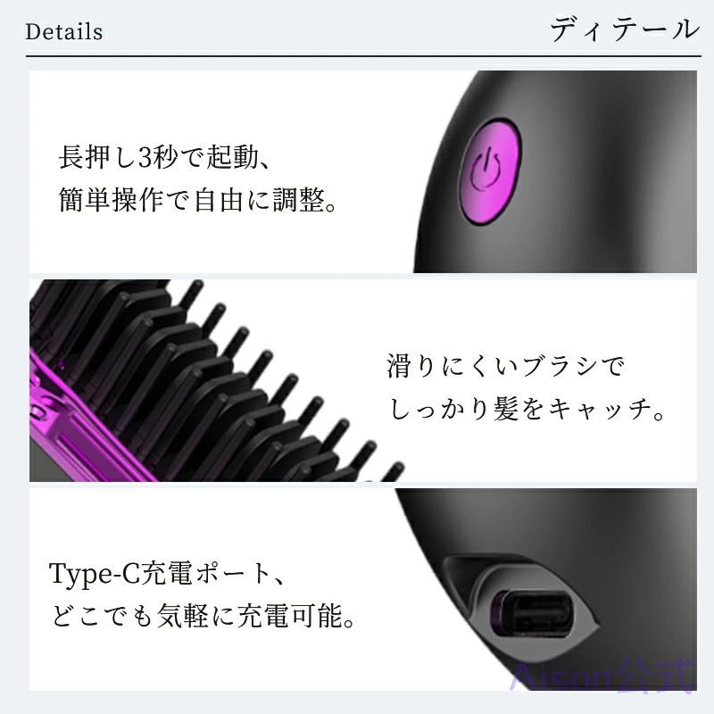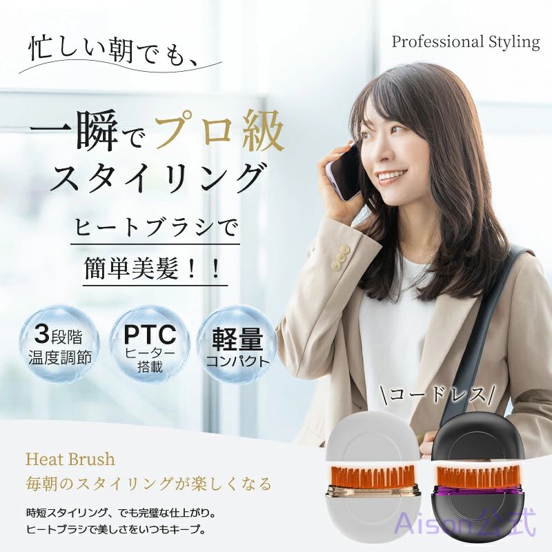 新登場のヒートブラシは、コードレスでコンパクトなデザインが特徴で、どこでも簡単にヘアスタイリングが楽しめます。手のひらサイズで持ち運びに便利なこのアイテムは、旅行や出張、日常の持ち歩きに最適です。3段階の温度調整機能を備えており、細かなニーズに応じて熱設定を変更できます。急速加熱機能により、使用準備が迅速にできるため、忙しい朝もスムーズに準備が可能です。