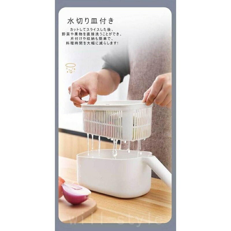 安全ホルダー付き。指が直接食材に触れずに野菜を切ることができます。特に子供が使う時怪我を防止することができます。さまざまな食材に合わせて、切れる厚み調節機能が付いていれば