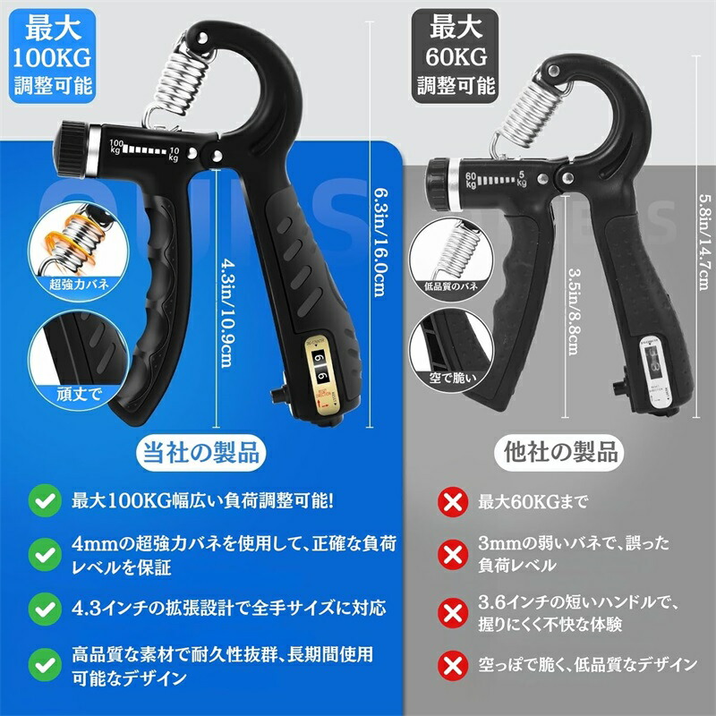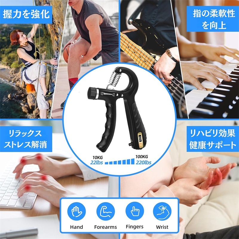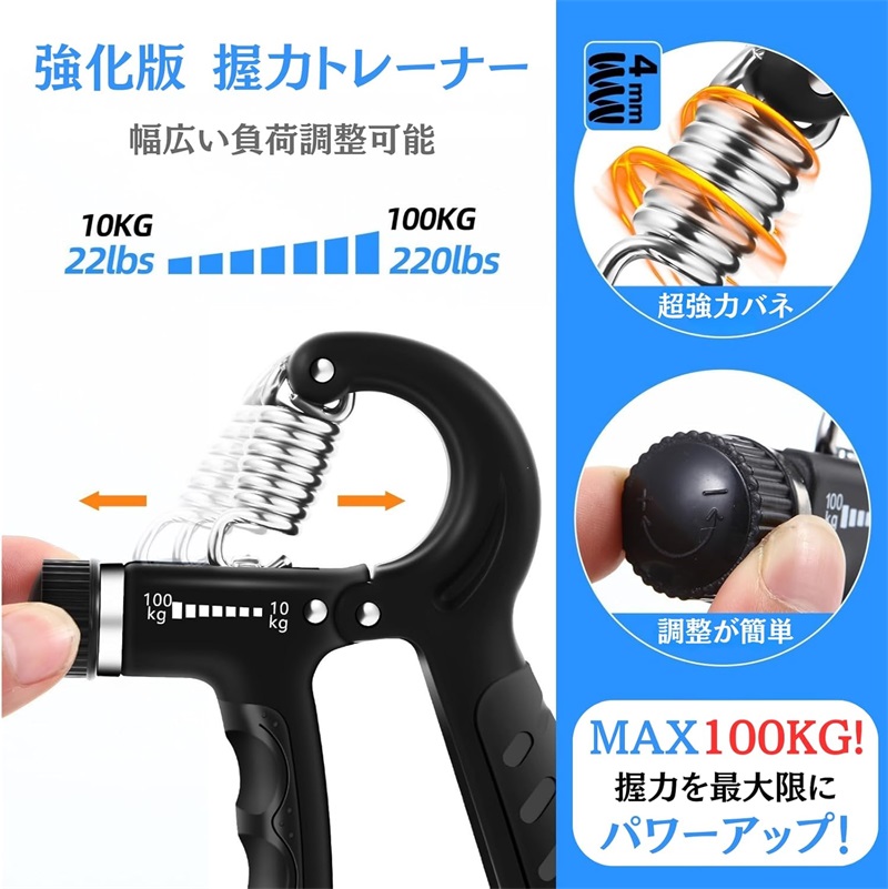 【強化版握力トレーナー】 : 10~100kgの幅広い負荷調整が可能なアップグレード版。初心者から上級者まで、全レベルのユーザーに最適なトレーニングを提供し、効果的に握力を強化します。手の筋力を最大限に引き出し、挑戦的なトレーニングにも対応します