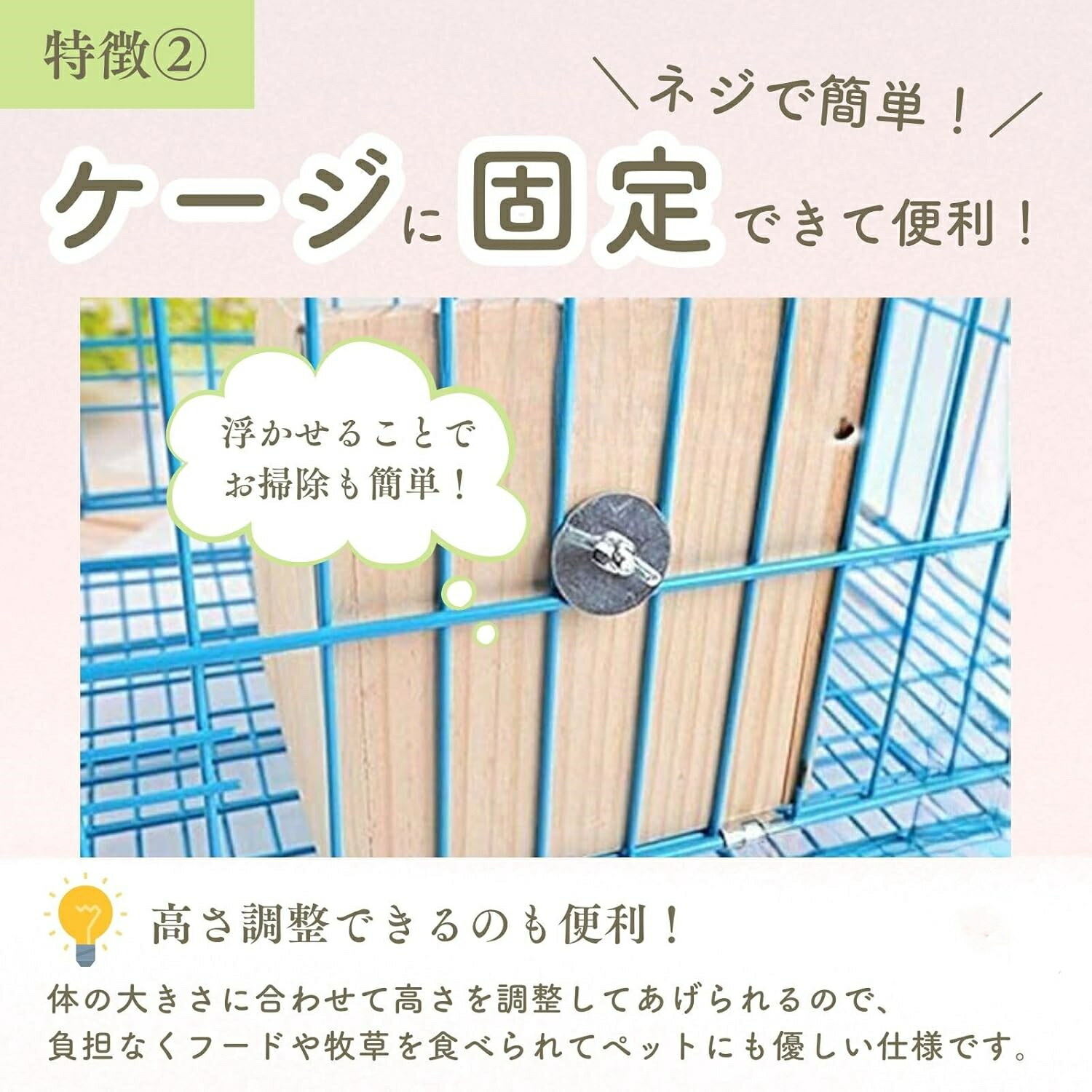 【清潔にお使い頂けます】飼い主としては、ケージの中はいつも清潔にしたいもの。 ペットの健康を考えてもケージをキレイに保つことはとても大切です。 こちらの餌入れは、ケージに固定し浮かせて設置出来るので、いつも清潔にお使い頂けます。 設置は簡単、後ろのネジで簡単に取り付けが可能です。 掃除の度に取り付けにストレスのかかるような事はありませんので、より快適に使って頂けます。