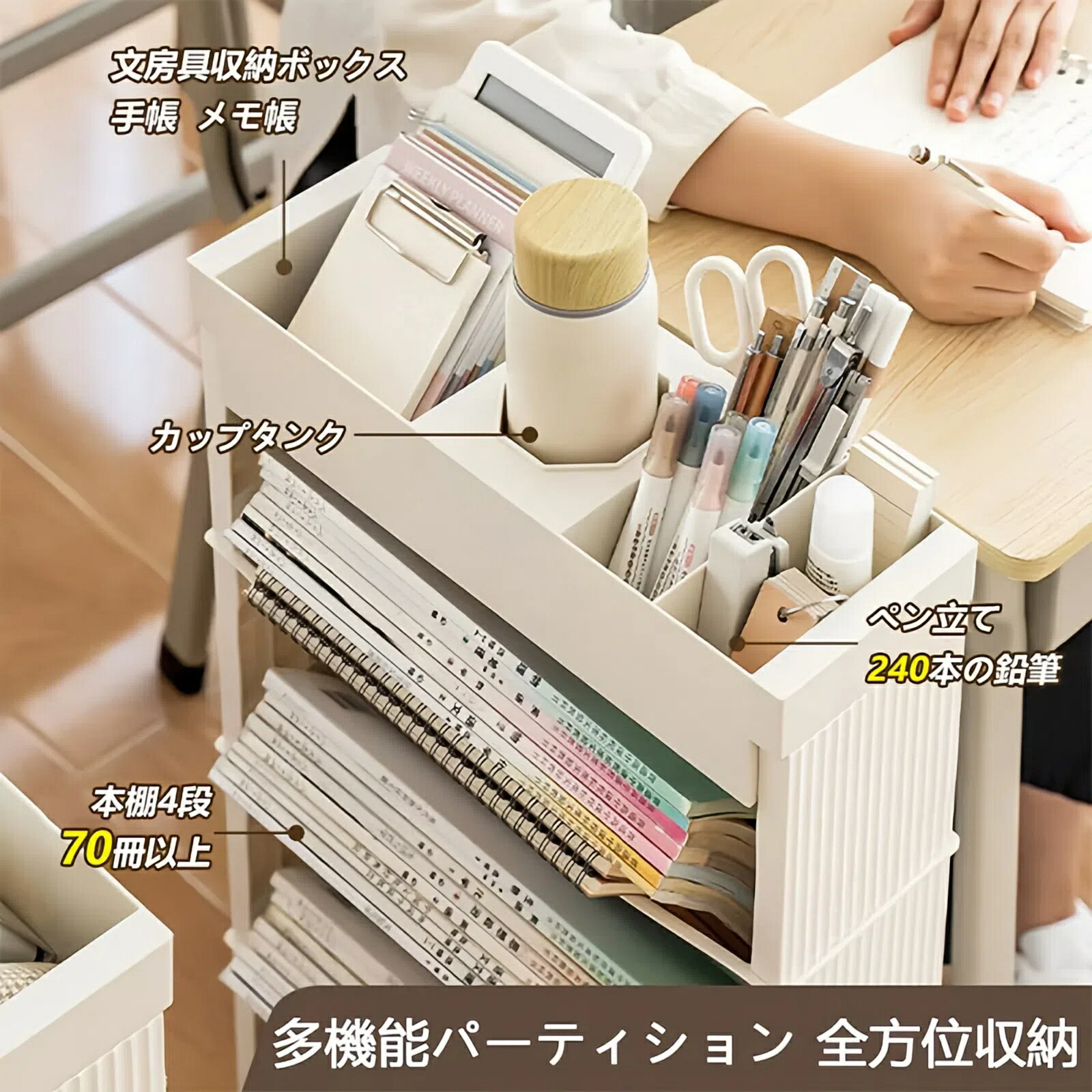 「スリムで大容量」スリムで隙間に置ける本棚です。4段のボックス、引き出し、収納トレーがあり、約70冊の本、文房具、ティッシュペーパー、コップなど収納できる。また、キャスターは360°回転可能で、お好きの方向に移動することができます。