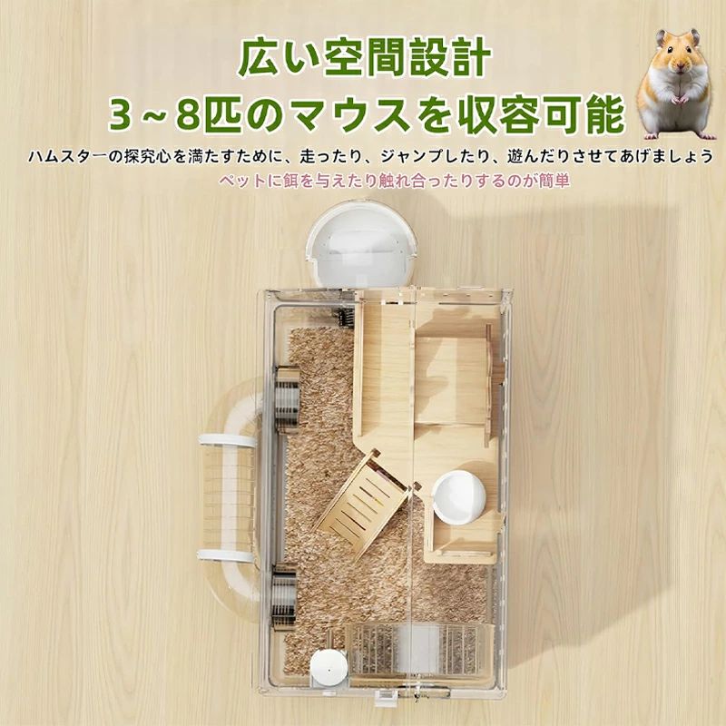 【便利な前開き設計お】しゃれで高級感あふれるデザインに、大きな前開き口部を組み合わせました。これにより、ハムスターとのコミュニケーションやエサやりが驚くほど簡単・ストレスフリーに! キンクマハムスター/ゴールデンハムスター/ジャンガリアンハムスターだけでなく、フクロモモンガ、ウサギ、爬虫類などの小動物飼育にも幅広く対応します。