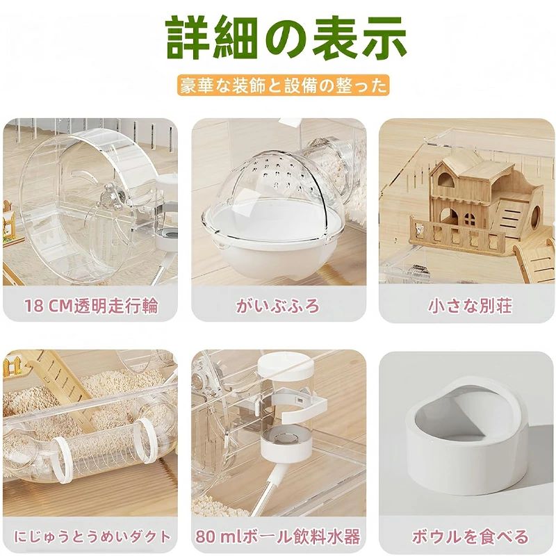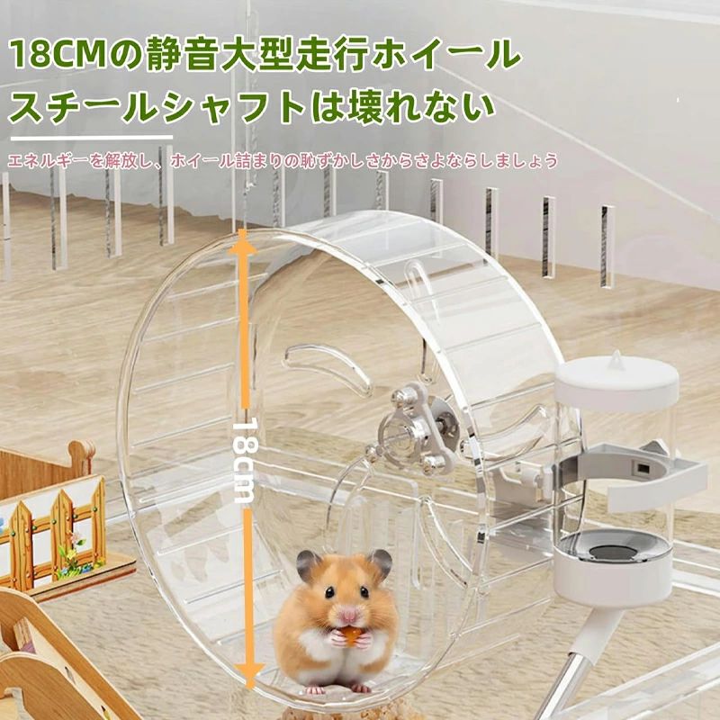 【豊富な拡張アクセサリー】 ハムスターケージ本体(W45×D30×H33cm)に加えて、18cm大型サイレント回し車、トンネル管(連結パイプ)、ステップ、トイレ、80ml給水ボトル、ハムスターのかじり防止加工木製ハウス、エサ入れなどがセットになっています。お好みに合わせて自由にレイアウトを組み立て、オリジナルの小動物の楽園を作り上げましょう!