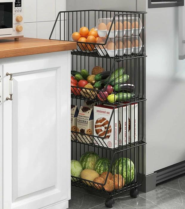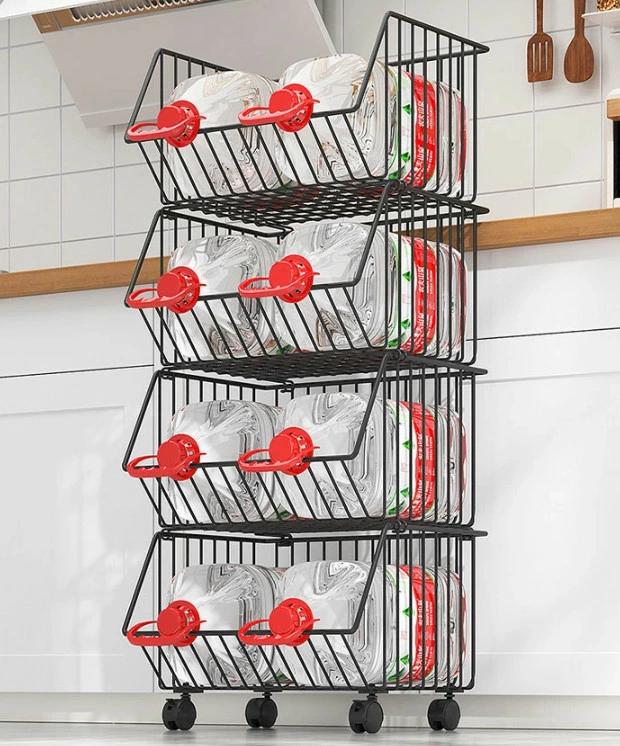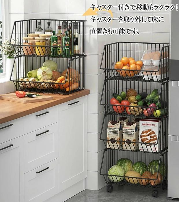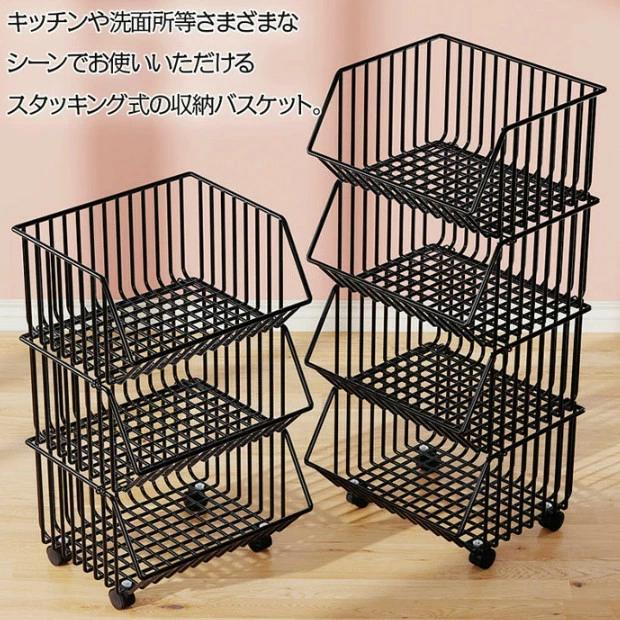 キッチンや洗面所等さまざまなシーンでお使いいただけるスタッキング式の収納バスケット。